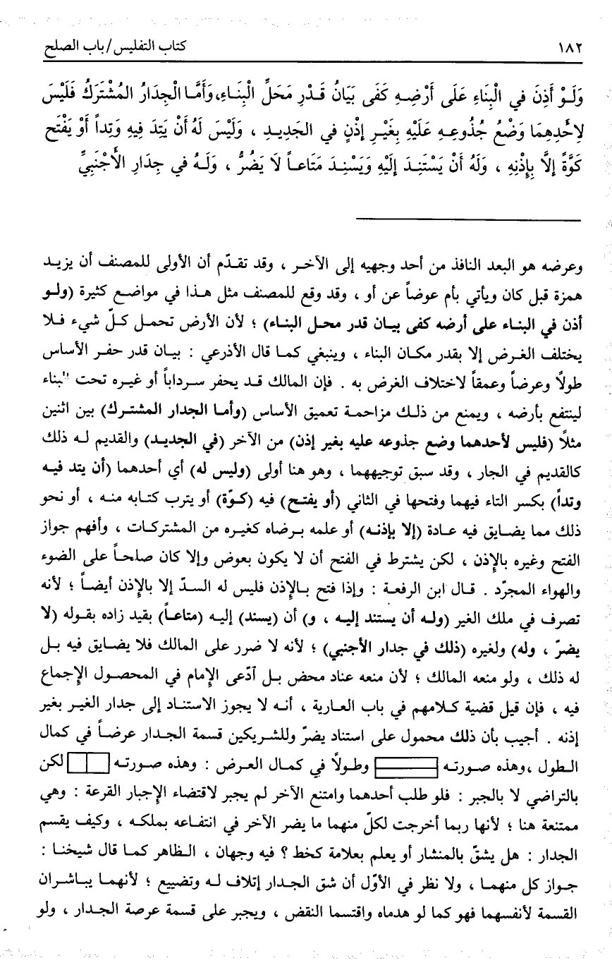 أُجِيبَ بِأَنَّ ذَلِكَ مَحْمُولٌ عَلَى اسْتِنَادٍ يَضُرُّ وَلِلشَّرِيكَيْنِ قِسْمَةُ الْجِدَارِ عَرْضًا فِي كَمَالِ الطُّولِ، وَهَذِهِ صُورَتُهُ وَطُولًا فِي كَمَالِ الْعَرْضِ: وَهَذِهِ صُورَتُهُ لَكِنْ بِالتَّرَاضِي لَا بِالْجَبْرِ: فَلَوْ طَلَبَ أَحَدُهُمَا وَامْتَنَعَ الْآخَرُ لَمْ يُجْبَرْ لِاقْتِضَاءِ الْإِجْبَارِ الْقُرْعَةَ: وَهِيَ مُمْتَنِعَةٌ هُنَا؛ لِأَنَّهَا رُبَّمَا أَخْرَجَتْ لِكُلٍّ مِنْهُمَا مَا يَضُرُّ الْآخَرَ فِي انْتِفَاعِهِ بِمِلْكِهِ، وَكَيْفَ يُقْسَمُ الْجِدَارُ: هَلْ يُشَقُّ بِالْمِنْشَارِ أَوْ يُعَلَّمَ بِعَلَامَةٍ كَخَطٍّ؟ فِيهِ وَجْهَانِ، الظَّاهِرُ كَمَا قَالَ شَيْخُنَا: جَوَازُ كُلٍّ مِنْهُمَا، وَلَا نَظَرَ فِي الْأَوَّلِ أَنَّ شِقَّ الْجِدَارِ إتْلَافٌ لَهُ وَتَضْيِيعٌ؛ لِأَنَّهُمَا يُبَاشِرَانِ الْقِسْمَةَ لِأَنْفُسِهِمَا فَهُوَ كَمَا لَوْ هَدَمَاهُ وَاقْتَسَمَا النَّقْضَ، وَيُجْبَرُ عَلَى قِسْمَةِ عَرْصَةِ الْجِدَارِ، وَلَوْ