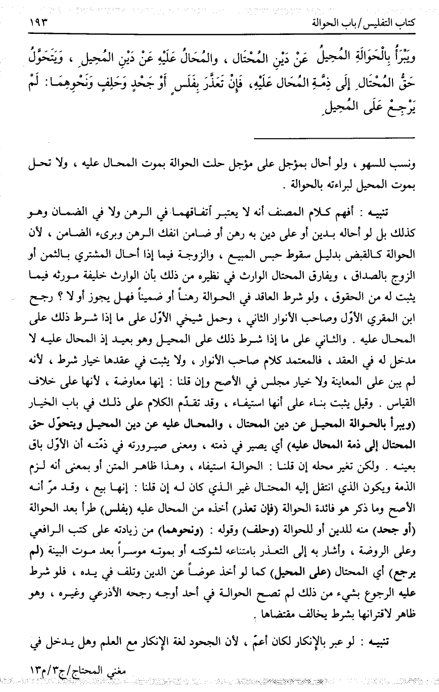 تَنْبِيهٌ أَفْهَمَ كَلَامُ الْمُصَنِّفِ أَنَّهُ لَا يُعْتَبَرُ اتِّفَاقُهُمَا فِي الرَّهْنِ وَلَا فِي الضَّمَانِ وَهُوَ كَذَلِكَ، بَلْ لَوْ أَحَالَهُ بِدَيْنٍ أَوْ عَلَى دَيْنٍ بِهِ رَهْنٌ أَوْ ضَامِنٌ انْفَكَّ الرَّهْنُ وَبَرِئَ الضَّامِنُ، لِأَنَّ الْحَوَالَةَ كَالْقَبْضِ بِدَلِيلِ سُقُوطِ حَبْسِ الْمَبِيعِ، وَالزَّوْجَةُ فِيمَا إذَا أَحَالَ الْمُشْتَرِي بِالثَّمَنِ أَوْ الزَّوْجُ بِالصَّدَاقِ، وَيُفَارِقُ الْمُحْتَالُ الْوَارِثَ فِي نَظِيرِهِ مِنْ ذَلِكَ بِأَنَّ الْوَارِثَ خَلِيفَةُ مُوَرِّثِهِ فِيمَا يَثْبُتُ لَهُ مِنْ الْحُقُوقِ، وَلَوْ شَرَطَ الْعَاقِدُ فِي الْحَوَالَةِ رَهْنًا أَوْ ضَمِينًا فَهَلْ يَجُوزُ أَوْ لَا؟ رَجَّحَ ابْنُ الْمُقْرِي الْأَوَّلَ، وَصَاحِبُ الْأَنْوَارِ الثَّانِي، وَحَمَلَ شَيْخِي الْأَوَّلَ عَلَى مَا إذَا شَرَطَ ذَلِكَ عَلَى الْمُحَالِ عَلَيْهِ. وَالثَّانِي عَلَى مَا إذَا شَرَطَ ذَلِكَ عَلَى الْمُحِيلِ وَهُوَ بَعِيدٌ، إذْ الْمُحَالُ عَلَيْهِ لَا مَدْخَلَ لَهُ فِي الْعَقْدِ، فَالْمُعْتَمَدُ كَلَامُ صَاحِبِ الْأَنْوَارِ، وَلَا يَثْبُتُ فِي عِقْدِهَا خِيَارُ شَرْطٍ، لِأَنَّهُ لَمْ يُبْنَ عَلَى الْمُعَايَنَةِ وَلَا خِيَارِ مَجْلِسٍ فِي الْأَصَحِّ، وَإِنْ قُلْنَا: إنَّهَا مُعَاوَضَةٌ، لِأَنَّهَا عَلَى خِلَافِ الْقِيَاسِ. وَقِيلَ يَثْبُتُ بِنَاءً عَلَى أَنَّهَا اسْتِيفَاءٌ، وَقَدْ تَقَدَّمَ الْكَلَامُ عَلَى ذَلِكَ فِي بَابِ الْخِيَارِ (وَيَبْرَأُ بِالْحَوَالَةِ الْمُحِيلُ عَنْ دَيْنِ الْمُحْتَالِ، وَالْمُحَالُ عَلَيْهِ عَنْ دَيْنِ الْمُحِيلِ وَيَتَحَوَّلُ حَقُّ الْمُحْتَالِ إلَى ذِمَّةِ الْمُحَالِ عَلَيْهِ) أَيْ يَصِيرُ فِي ذِمَّتِهِ، وَمَعْنَى صَيْرُورَتِهِ فِي ذِمَّتِهِ أَنَّ الْأَوَّلَ بَاقٍ بِعَيْنِهِ. وَلَكِنْ تَغَيَّرَ مَحَلُّهُ إنْ قُلْنَا: الْحَوَالَةُ اسْتِيفَاءٌ، وَهَذَا ظَاهِرُ الْمَتْنِ، أَوْ بِمَعْنَى أَنَّهُ لَزِمَ الذِّمَّةَ وَيَكُونُ الَّذِي انْتَقَلَ إلَيْهِ الْمُحْتَالُ غَيْرَ الَّذِي كَانَ لَهُ إنْ قُلْنَا: إنَّهَا بَيْعٌ، وَقَدْ مَرَّ أَنَّهُ الْأَصَحُّ وَمَا ذُكِرَ هُوَ فَائِدَةُ الْحَوَالَةِ (فَإِنْ تَعَذَّرَ) أَخَذَهُ مِنْ الْمُحَالِ عَلَيْهِ (بِفَلَسٍ) طَرَأَ بَعْدَ الْحَوَالَةِ (أَوْ جَحْدٍ) مِنْهُ لِلدَّيْنِ أَوْ لِلْحَوَالَةِ (وَحَلِفٍ) وَقَوْلُهُ: (وَنَحْوِهِمَا) مِنْ زِيَادَتِهِ عَلَى كُتُبِ الرَّافِعِيِّ وَعَلَى الرَّوْضَةِ، وَأَشَارَ بِهِ إلَى التَّعَذُّرِ بِامْتِنَاعِهِ لِشَوْكَتِهِ أَوْ بِمَوْتِهِ مُوسِرًا بَعْدَ مَوْتِ الْبَيِّنَةِ (لَمْ يَرْجِعْ) أَيْ الْمُحْتَالُ (عَلَى الْمُحِيلِ) كَمَا لَوْ أَخَذَ عِوَضًا عَنْ الدَّيْنِ وَتَلَفَ فِي يَدِهِ، فَلَوْ شَرَطَ عَلَيْهِ الرُّجُوعَ بِشَيْءٍ مِنْ ذَلِكَ لَمْ تَصِحَّ الْحَوَالَةُ فِي أَحَدِ أَوْجُهٍ رَجَّحَهُ الْأَذْرَعِيُّ وَغَيْرُهُ، وَهُوَ ظَاهِرٌ لِاقْتِرَانِهَا بِشَرْطٍ يُخَالِفُ مُقْتَضَاهَا.