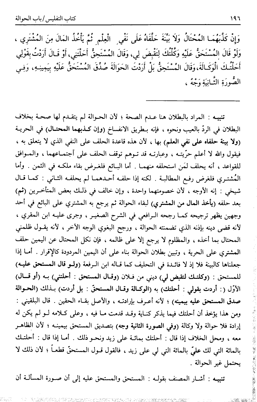 ـــــــــــــــــــــــــــــQتَنْبِيهٌ الْمُرَادُ بِالْبُطْلَانِ هُنَا عَدَمُ الصِّحَّةِ؛ لِأَنَّ الْحَوَالَةَ لَمْ يَتَقَدَّمْ لَهَا صِحَّةٌ بِخِلَافِ الْبُطْلَانِ فِي الرَّدِّ بِالْعَيْبِ وَنَحْوِهِ، فَإِنَّهُ بِطَرِيقِ الِانْفِسَاخِ (وَإِنْ كَذَّبَهُمَا الْمُحْتَالُ) فِي الْحُرِّيَّةِ (وَلَا بَيِّنَةَ حَلَّفَاهُ عَلَى نَفْيِ الْعِلْمِ) بِهَا، لِأَنَّ هَذِهِ قَاعِدَةُ الْحَلِفِ عَلَى النَّفْيِ الَّذِي لَا يَتَعَلَّقُ بِهِ، فَيَقُولُ: وَاَللَّهِ لَا أَعْلَمُ حُرِّيَّتَهُ، وَعِبَارَتُهُ قَدْ تُوهِمُ تَوَقُّفَ الْحَلِفِ عَلَى اجْتِمَاعِهِمَا، وَالْمُوَافِقُ لِلْقَوَاعِدِ، أَنَّهُ يَحْلِفُ لِمَنْ اسْتَحْلَفَهُ مِنْهُمَا. أَمَّا الْبَائِعُ فَلِغَرَضِ بَقَاءِ مِلْكِهِ فِي الثَّمَنِ. وَأَمَّا الْمُشْتَرِي فَلِغَرَضِ رَفْعِ الْمُطَالَبَةِ. لَكِنَّهُ إذَا حَلَّفَهُ أَحَدُهُمَا لَمْ يُحَلِّفْهُ الثَّانِي: كَمَا قَالَ شَيْخِي: إنَّهُ الْأَوْجَهُ، لِأَنَّ خُصُومَتَهُمَا وَاحِدَةٌ، وَإِنْ خَالَفَ فِي ذَلِكَ بَعْضُ الْمُتَأَخِّرِينَ (ثُمَّ) بَعْدَ حَلِفِهِ (يَأْخُذُ الْمَالَ مِنْ الْمُشْتَرِي) لِبَقَاءِ الْحَوَالَةِ، ثُمَّ يَرْجِعُ بِهِ الْمُشْتَرِي عَلَى الْبَائِعِ فِي أَحَدِ وَجْهَيْنِ يَظْهَرُ تَرْجِيحُهُ كَمَا رَجَّحَهُ الرَّافِعِيُّ فِي الشَّرْحِ الصَّغِيرِ، وَجَرَى عَلَيْهِ ابْنُ الْمُقْرِي، لِأَنَّهُ قَضَى دَيْنَهُ بِإِذْنِهِ الَّذِي تَضَمَّنَتْهُ الْحَوَالَةُ، وَرَجَّحَ الْبَغَوِيّ الْوَجْهَ الْآخَرَ، لِأَنَّهُ يَقُولُ ظَلَمَنِي الْمُحْتَالُ بِمَا أَخَذَهُ، وَالْمَظْلُومُ لَا يَرْجِعُ إلَّا عَلَى ظَالِمِهِ، فَإِنْ نَكَلَ الْمُحْتَالُ عَنْ الْيَمِينِ حَلَفَ الْمُشْتَرِي عَلَى الْحُرِّيَّةِ، وَتَبَيَّنَ بُطْلَانُ الْحَوَالَةِ بِنَاءً عَلَى أَنَّ الْيَمِينَ الْمَرْدُودَةَ كَالْإِقْرَارِ أَمَّا إذَا جَعَلْنَاهَا كَالْبَيِّنَةِ فَلَا، إذْ لَا فَائِدَةَ فِي التَّحْلِيفِ كَمَا قَالَهُ ابْنُ الرِّفْعَةِ.