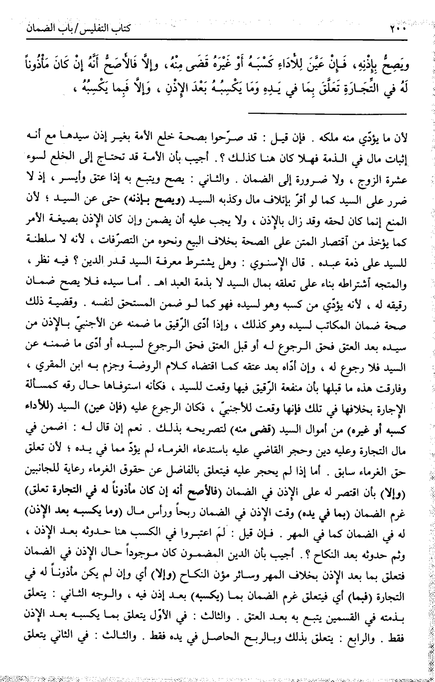 أُجِيبَ بِأَنَّ الدَّيْنَ الْمَضْمُونَ كَانَ مَوْجُودًا حَالَ الْإِذْنِ فِي الضَّمَانِ فَتَعَلَّقَ بِمَا بَعْدَ الْإِذْنِ، بِخِلَافِ الْمَهْرِ وَسَائِرِ مُؤَنِ النِّكَاحِ (وَإِلَّا) أَيْ، وَإِنْ لَمْ يَكُنْ مَأْذُونًا لَهُ فِي التِّجَارَةِ (فَبِمَا) أَيْ فَيَتَعَلَّقُ غُرْمُ الضَّمَانِ بِمَا (يَكْسِبُهُ) بَعْدَ إذْنٍ فِيهِ، وَالْوَجْهُ الثَّانِي يَتَعَلَّقُ بِذِمَّتِهِ فِي الْقِسْمَيْنِ يُتْبَعُ بِهِ بَعْدَ الْعِتْقِ. وَالثَّالِثُ فِي الْأَوَّلِ يَتَعَلَّقُ بِمَا يَكْسِبُهُ بَعْدَ الْإِذْنِ فَقَطْ. وَالرَّابِعُ يَتَعَلَّقُ بِذَلِكَ وَبِالرِّبْحِ الْحَاصِلِ فِي يَدِهِ فَقَطْ. وَالثَّالِثُ: فِي الثَّانِي يَتَعَلَّقُ