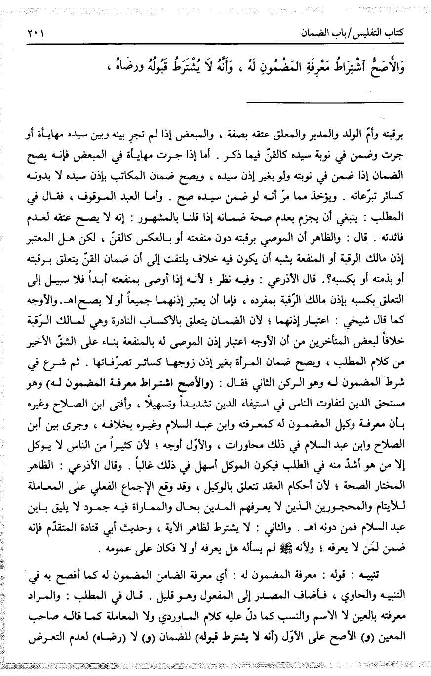 . ثُمَّ شَرَعَ فِي شَرْطِ الْمَضْمُونِ لَهُ وَهُوَ الرُّكْنُ الثَّانِي فَقَالَ: (وَالْأَصَحُّ اشْتِرَاطُ مَعْرِفَةِ الْمَضْمُونِ لَهُ) وَهُوَ مُسْتَحِقُّ الدَّيْنِ لِتَفَاوُتِ النَّاسِ فِي اسْتِيفَاءِ الدَّيْنِ تَشْدِيدًا وَتَسْهِيلًا، وَأَفْتَى ابْنُ الصَّلَاحِ وَغَيْرُهُ بِأَنَّ مَعْرِفَةَ وَكِيلِ الْمَضْمُونِ كَمَعْرِفَتِهِ وَابْنُ عَبْدِ السَّلَامِ وَغَيْرِهِ بِخِلَافِهِ، وَجَرَى بَيْنَ ابْنِ الصَّلَاحِ وَابْنِ عَبْدِ السَّلَامِ فِي ذَلِكَ مُحَاوَرَاتٌ، وَالْأَوَّلُ أَوْجَهُ؛ لِأَنَّ كَثِيرًا مِنْ النَّاسِ لَا يُوَكِّلُ إلَّا مَنْ هُوَ أَشَدُّ مِنْهُ فِي الطَّلَبِ، فَيَكُونُ الْمُوَكِّلُ أَسْهَلَ فِي ذَلِكَ غَالِبًا. وَقَالَ الْأَذْرَعِيُّ: الظَّاهِرُ الْمُخْتَارُ الصِّحَّةُ؛ لِأَنَّ أَحْكَامَ الْعَقْدِ تَتَعَلَّقُ بِالْوَكِيلِ، وَقَدْ وَقَعَ الْإِجْمَاعُ الْفِعْلِيُّ عَلَى الْمُعَامَلَةِ لِلْأَيْتَامِ وَالْمَحْجُورِينَ الَّذِينَ لَا يَعْرِفهُمْ الْمَدِينُ بِحَالٍ، وَالْمُمَارَاةُ فِيهِ جُمُودٌ لَا يَلِيقُ بِابْنِ عَبْدِ السَّلَامِ فَمَنْ دُونَهُ اهـ.