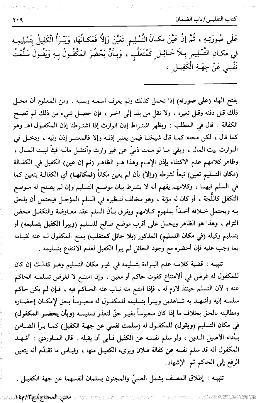 (ثُمَّ إنْ عَيَّنَ) الْكَفِيلُ فِي الْكَفَالَةِ (مَكَانٍ التَّسْلِيمِ تَعَيَّنَ) تَبَعًا لِشَرْطِهِ (وَإِلَّا) بِأَنْ لَمْ يُعَيَّنْ مَكَانًا (فَمَكَانُهَا) أَيْ الْكَفَالَةُ يَتَعَيَّنُ كَمَا فِي السَّلَمِ فِيهِمَا، وَكَلَامُهُمْ يُفْهِمُ أَنَّهُ لَا يُشْتَرَطُ بَيَانُ مَوْضِعِ التَّسْلِيمِ، وَإِنْ لَمْ يَصْلُحْ لَهُ مَوْضِعُ التَّكَفُّلِ كَاللُّجَّةِ، أَوْ كَانَ لَهُ مُؤْنَةٌ، وَهُوَ مُخَالِفٌ لِنَظِيرِهِ فِي السَّلَمِ الْمُؤَجَّلِ. فَيُحْتَمَلُ أَنْ يُلْحَقَ بِهِ وَيُحْتَمَلُ خِلَافُهُ أَخْذًا بِمَفْهُومِ كَلَامِهِمْ وَيُفَرَّقُ بِأَنَّ السَّلَمَ عَقْدُ مُعَاوَضَةٍ وَالتَّكَفُّلُ مَحْضُ الْتِزَامٍ، وَهَذَا هُوَ الظَّاهِرُ، وَيُحْمَلُ عَلَى أَقْرَبِ مَوْضِعٍ صَالِحٍ لِلتَّسْلِيمِ (وَيَبْرَأُ الْكَفِيلُ بِتَسْلِيمِهِ) أَوْ بِتَسْلِيمِ وَكِيلِهِ (فِي مَكَانِ التَّسْلِيمِ) الْمَذْكُورِ (بِلَا حَائِلٍ كَمُتَغَلِّبٍ) يَمْنَعُ الْمَكْفُولَ لَهُ عَنْهُ لِقِيَامِهِ بِمَا وَجَبَ عَلَيْهِ فَإِنْ أَحْضَرَهُ مَعَ وُجُودِ الْحَائِلِ لَمْ يَبْرَأْ الْكَفِيلُ لِعَدَمِ الِانْتِفَاعِ بِتَسْلِيمِهِ.