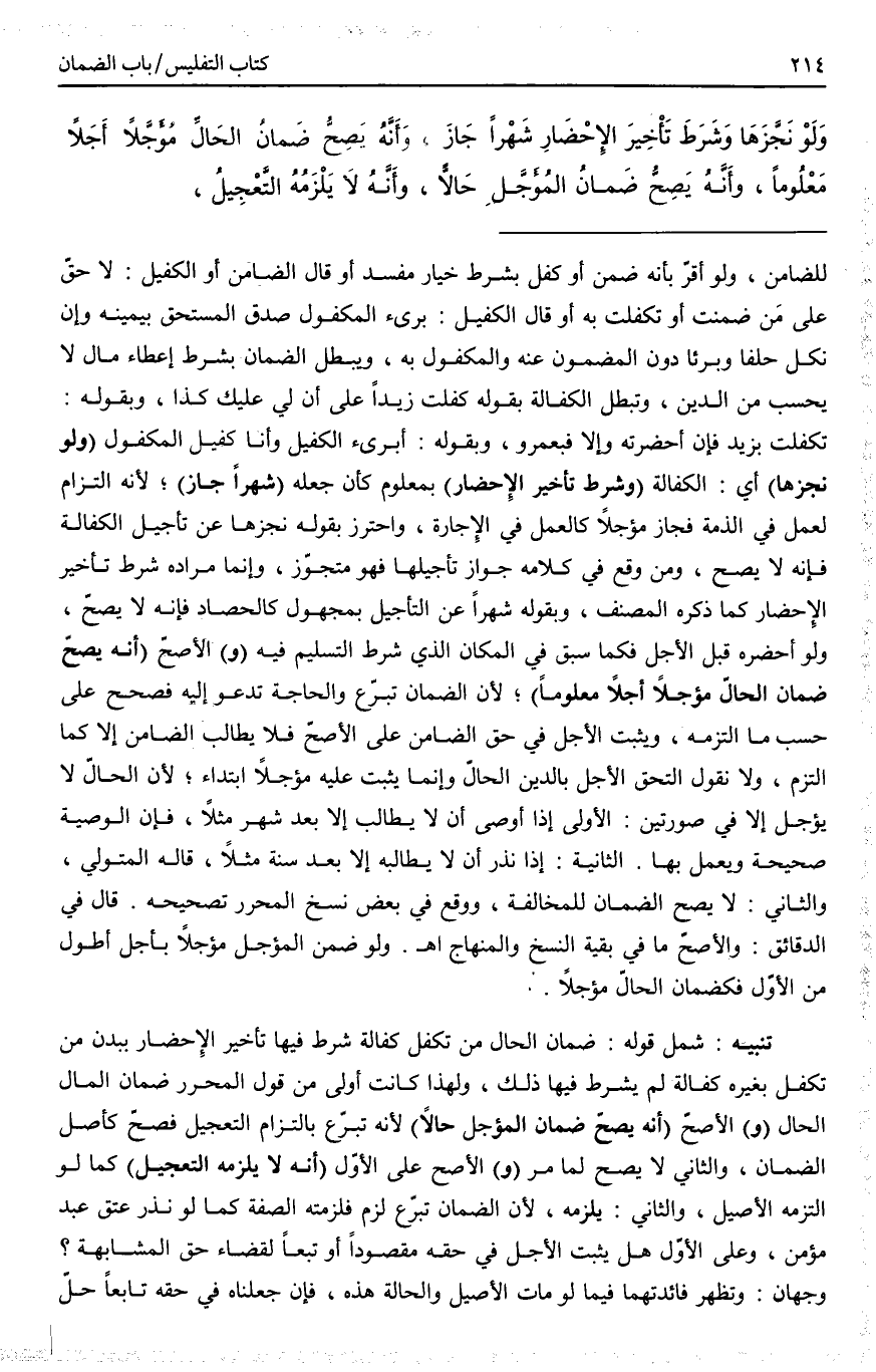 تَنْبِيهٌ شَمَلَ قَوْلُهُ: ضَمَانُ الْحَالِّ مَنْ تَكَفَّلَ كَفَالَةً شَرَطَ فِيهَا تَأْخِيرَ الْإِحْضَارِ بِبَدَنِ مَنْ تَكَفَّلَ بِغَيْرِهِ كَفَالَةً لَمْ يَشْرُطْ فِيهَا ذَلِكَ وَلِهَذَا كَانَتْ أَوْلَى مِنْ قَوْلِ الْمُحَرَّرِ ضَمَانُ الْمَالِ الْحَالِّ (وَ) الْأَصَحُّ (أَنَّهُ يَصِحُّ ضَمَانُ الْمُؤَجَّلِ حَالًّا) لِأَنَّهُ تَبَرُّعٌ بِالْتِزَامِ التَّعْجِيلِ فَصَحَّ كَأَصْلِ الضَّمَانِ، وَالثَّانِي لَا يَصِحُّ لِمَا مَرَّ (وَ) الْأَصَحُّ عَلَى الْأَوَّلِ (أَنَّهُ لَا يَلْزَمُهُ التَّعْجِيلُ) كَمَا لَوْ الْتَزَمَهُ الْأَصِيلُ، وَالثَّانِي يَلْزَمُهُ لِأَنَّ الضَّمَانَ تَبَرُّعٌ لَزِمَ فَلَزِمَتْهُ الصِّفَةُ كَمَا لَوْ نَذَرَ عِتْقَ عَبْدٍ مُؤْمِنٍ، وَعَلَى الْأَوَّلِ هَلْ يَثْبُتُ الْأَجَلُ فِي حَقِّهِ مَقْصُودًا أَوْ تَبَعًا لِقَضَاءِ حَقِّ الْمُشَابَهَةِ؟ وَجْهَانِ: وَتَظْهَرُ فَائِدَتُهُمَا فِيمَا لَوْ مَاتَ الْأَصِيلُ وَالْحَالَةُ هَذِهِ، فَإِنْ جَعَلْنَاهُ فِي حَقِّهِ تَابِعًا حَلَّ