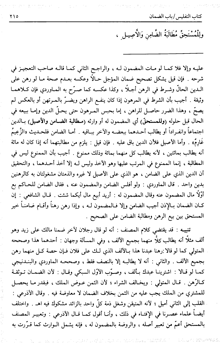 أُجِيبَ بِأَنَّ الْمَمْنُوعَ لَيْسَ فِي الْمُطَالَبَةِ، إنَّمَا الْمَمْنُوعُ فِي الْمُرَتَّبِ عَلَيْهِ وَهُوَ الْأَخْذُ وَلَيْسَ لَهُ إلَّا أَخْذُ أَحَدِهِمَا. وَالتَّحْقِيقُ أَنَّ الدَّيْنَ الَّذِي عَلَى الضَّامِنِ، هُوَ الَّذِي عَلَى الْأَصِيلِ لَا غَيْرِهِ وَالذِّمَّتَانِ مَشْغُولَتَانِ بِهِ كَالرَّهْنَيْنِ بِدَيْنٍ وَاحِدٍ.