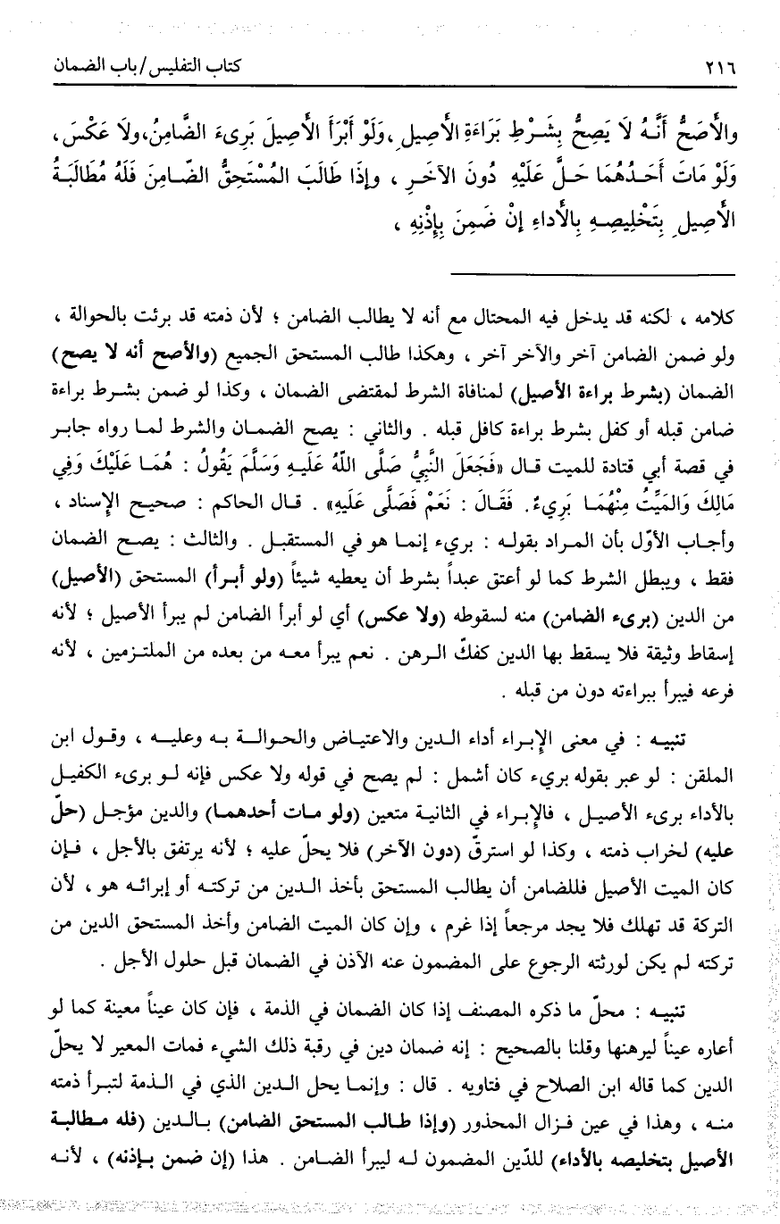 (وَالْأَصَحُّ أَنَّهُ لَا يَصِحُّ) الضَّمَانُ (بِشَرْطِ بَرَاءَةِ الْأَصِيلِ) لِمُنَافَاةِ الشَّرْطِ لِمُقْتَضَى الضَّمَانِ، وَكَذَا لَوْ ضَمِنَ بِشَرْطِ بَرَاءَةِ ضَامِنٍ قَبْلَهُ أَوْ كَفَلَ بِشَرْطِ بَرَاءَةِ كَافِلٍ قَبْلَهُ.