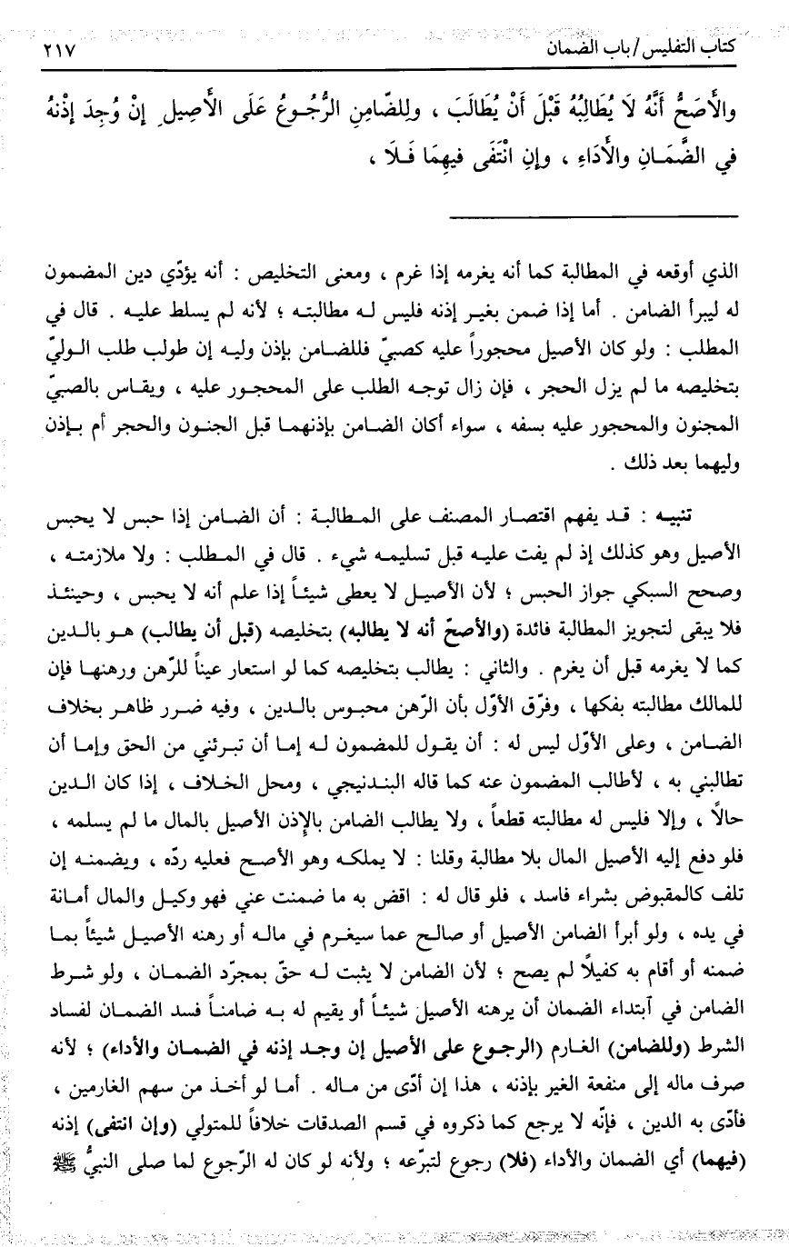 ـــــــــــــــــــــــــــــQالَّذِي أَوْقَعَهُ فِي الْمُطَالَبَةِ كَمَا أَنَّهُ يَغْرَمُهُ إذَا غَرِمَ، وَمَعْنَى التَّخْلِيصِ: أَنَّهُ يُؤَدِّي دَيْنَ الْمَضْمُونِ لَهُ لِيَبْرَأَ الضَّامِنُ. أَمَّا إذَا ضَمِنَ بِغَيْرِ إذْنِهِ فَلَيْسَ لَهُ مُطَالَبَتُهُ؛ لِأَنَّهُ لَمْ يُسَلَّطْ عَلَيْهِ. قَالَ فِي الْمَطْلَبِ: وَلَوْ كَانَ الْأَصِيلُ مَحْجُورًا عَلَيْهِ كَصَبِيٍّ فَلِلضَّامِنِ بِإِذْنِ وَلِيِّهِ إنْ طُولِبَ طَلَبَ الْوَلِيُّ بِتَخْلِيصِهِ مَا لَمْ يَزُلْ الْحَجْرُ، فَإِنْ زَالَ تَوَجَّهَ الطَّلَبُ عَلَى الْمَحْجُورِ عَلَيْهِ، وَيُقَاسُ بِالصَّبِيِّ الْمَجْنُونُ وَالْمَحْجُورُ عَلَيْهِ بِسَفَهٍ، سَوَاءٌ أَكَانَ الضَّامِنُ بِإِذْنِهِمَا قَبْلَ الْجُنُونِ وَالْحَجْرِ أَمْ بِإِذْنِ وَلِيِّهِمَا بَعْدَ ذَلِكَ.