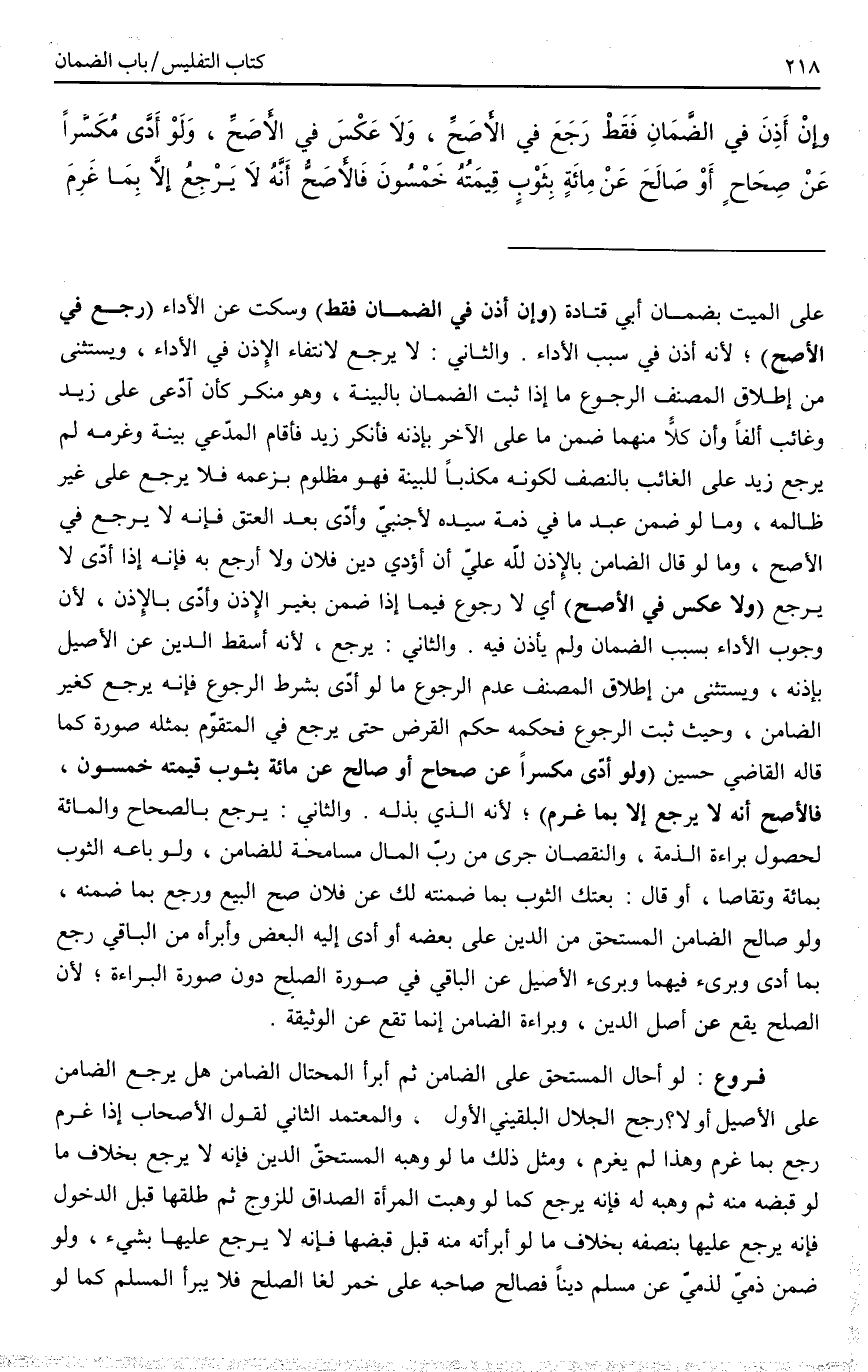 . فُرُوعٌ لَوْ أَحَالَ الْمُسْتَحِقُّ عَلَى الضَّامِنِ، ثُمَّ أَبْرَأَ الْمُحْتَالُ الضَّامِنَ هَلْ يَرْجِعُ الضَّامِنُ عَلَى الْأَصِيلِ أَوْ لَا؟ رَجَّحَ الْجَلَالُ الْبُلْقِينِيُّ الْأَوَّلَ وَالْمُعْتَمَدُ الثَّانِي لِقَوْلِ الْأَصْحَابِ إذَا غَرِمَ رَجَعَ بِمَا غَرِمَ وَهَذَا لَمْ يَغْرَمْ، وَمِثْلُ ذَلِكَ مَا لَوْ وَهَبَهُ الْمُسْتَحِقُّ الدَّيْنَ فَإِنَّهُ لَا يَرْجِعُ بِخِلَافِ مَا لَوْ قَبَضَهُ مِنْهُ، ثُمَّ وَهَبَهُ لَهُ فَإِنَّهُ يَرْجِعُ كَمَا لَوْ وَهَبَتْ الْمَرْأَةُ الصَّدَاقَ لِلزَّوْجِ، ثُمَّ طَلَّقَهَا قَبْلَ الدُّخُولِ فَإِنَّهُ يَرْجِعُ عَلَيْهَا بِنِصْفِهِ بِخِلَافِ مَا لَوْ أَبْرَأَتْهُ مِنْهُ قَبْلَ قَبْضِهَا فَإِنَّهُ لَا يَرْجِعُ عَلَيْهَا بِشَيْءٍ، وَلَوْ ضَمِنَ ذِمِّيٌّ لِذِمِّيٍّ عَنْ مُسْلِمٍ دَيْنًا فَصَالَحَ صَاحِبَهُ عَلَى خَمْرٍ لَغَا الصُّلْحُ فَلَا يَبْرَأُ الْمُسْلِمُ كَمَا لَوْ