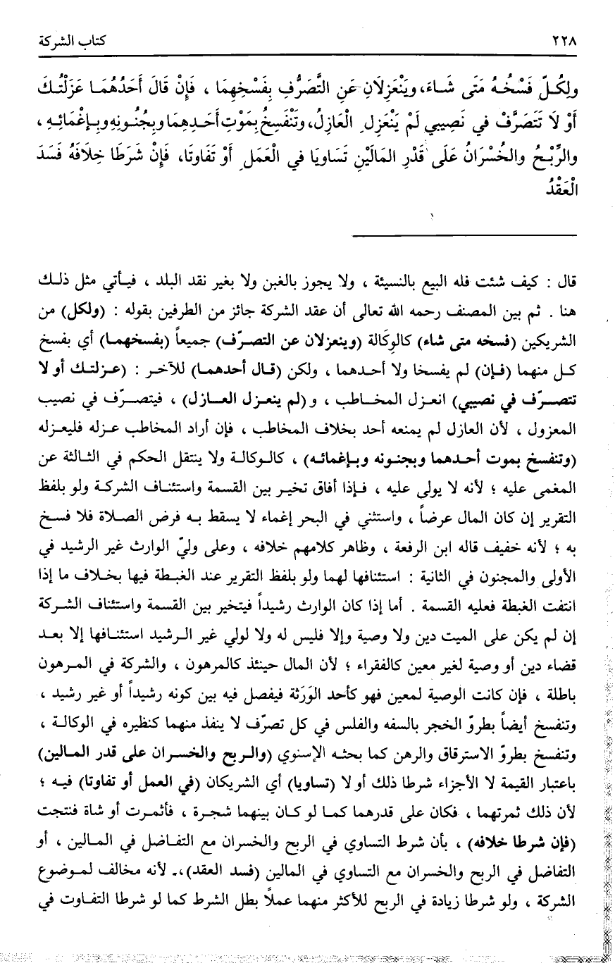 ، ثُمَّ بَيَّنَ الْمُصَنِّفُ - رَحِمَهُ اللَّهُ تَعَالَى - أَنَّ عَقْدَ الشَّرِكَةِ جَائِزٌ مِنْ الطَّرَفَيْنِ بِقَوْلِهِ: (وَلِكُلٍّ) مِنْ الشَّرِيكَيْنِ (فَسْخُهُ مَتَى شَاءَ) كَالْوَكَالَةِ (وَيَنْعَزِلَانِ عَنْ التَّصَرُّفِ) جَمِيعًا (بِفَسْخِهِمَا) أَيْ بِفَسْخِ كُلٍّ مِنْهُمَا (فَإِنْ) لَمْ يَفْسَخَا وَلَا أَحَدُهُمَا، وَلَكِنْ (قَالَ أَحَدُهُمَا) لِلْآخَرِ: (عَزَلْتُك أَوْ لَا تَتَصَرَّفْ فِي نَصِيبِي) انْعَزَلَ الْمُخَاطَبُ، وَ (لَمْ يَنْعَزِلْ الْعَازِلُ) فَيَتَصَرَّفُ فِي نَصِيبِ الْمَعْزُولِ؛ لِأَنَّ الْعَازِلَ لَمْ يَمْنَعْهُ أَحَدٌ بِخِلَافِ الْمُخَاطَبِ، فَإِنْ أَرَادَ الْمُخَاطَبُ عَزْلَهُ فَلِيَعْزِلَهُ.