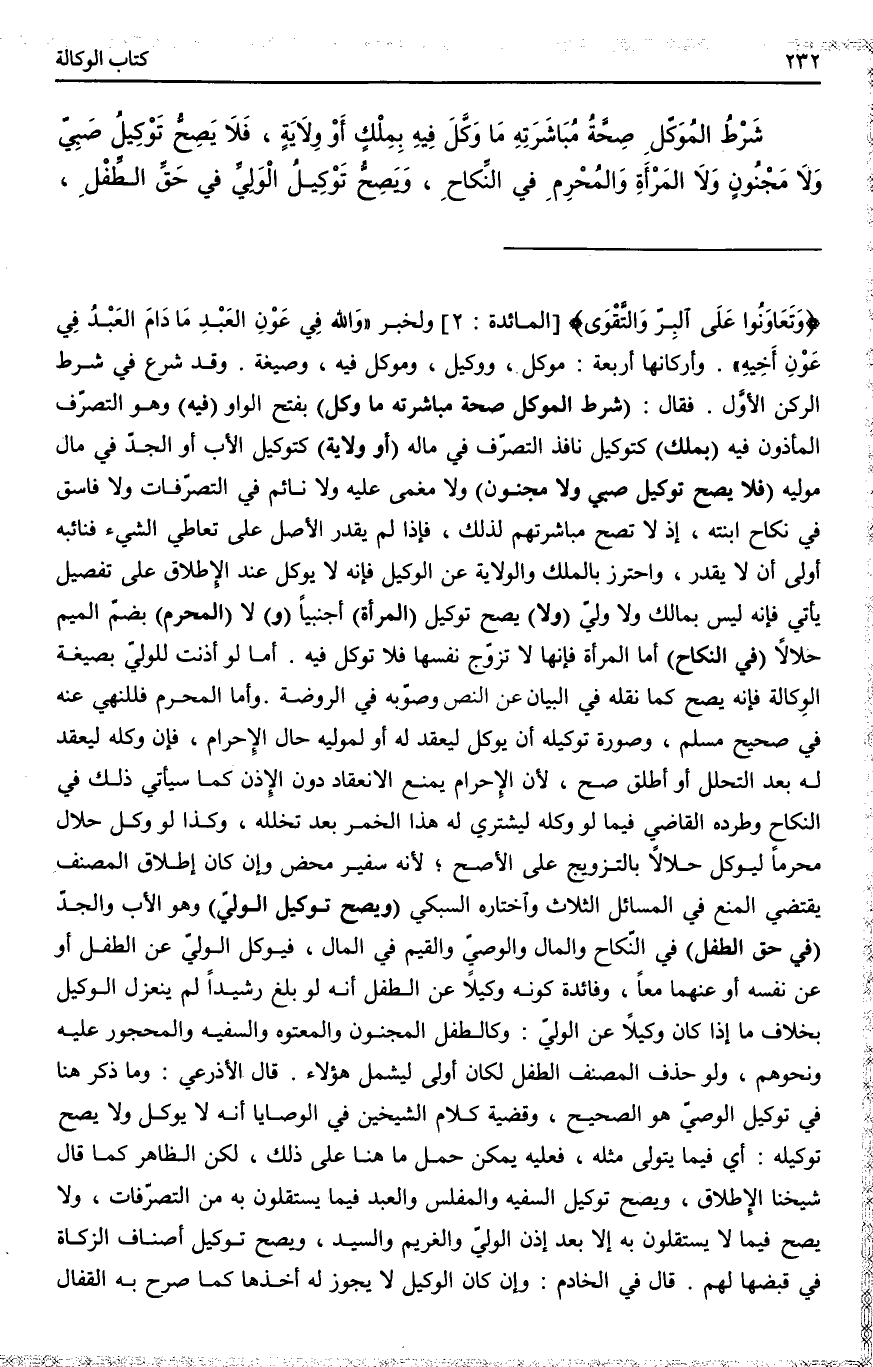 ـــــــــــــــــــــــــــــQ {وَتَعَاوَنُوا عَلَى الْبِرِّ وَالتَّقْوَى} [المائدة: 2] وَلِخَبَرِ «وَاَللَّهُ فِي عَوْنِ الْعَبْدِ مَا دَامَ الْعَبْدُ فِي عَوْنِ أَخِيهِ» وَأَرْكَانُهَا أَرْبَعَةٌ: مُوَكِّلٌ، وَوَكِيلٌ، وَمُوَكَّلٌ فِيهِ، وَصِيغَةٌ. وَقَدْ شَرَعَ فِي شَرْطِ الرُّكْنِ الْأَوَّلِ فَقَالَ: (شَرْطُ الْمُوَكِّلِ صِحَّةُ مُبَاشَرَتِهِ مَا وَكَّلَ) بِفَتْحِ الْوَاوِ (فِيهِ) وَهُوَ التَّصَرُّفُ الْمَأْذُونُ فِيهِ (بِمِلْكٍ) كَتَوْكِيلِ نَافِذِ التَّصَرُّفِ فِي مَالِهِ (أَوْ وِلَايَةٍ) كَتَوْكِيلِ الْأَبِ أَوْ الْجَدِّ فِي مَالِ مُوَلِّيهِ.
