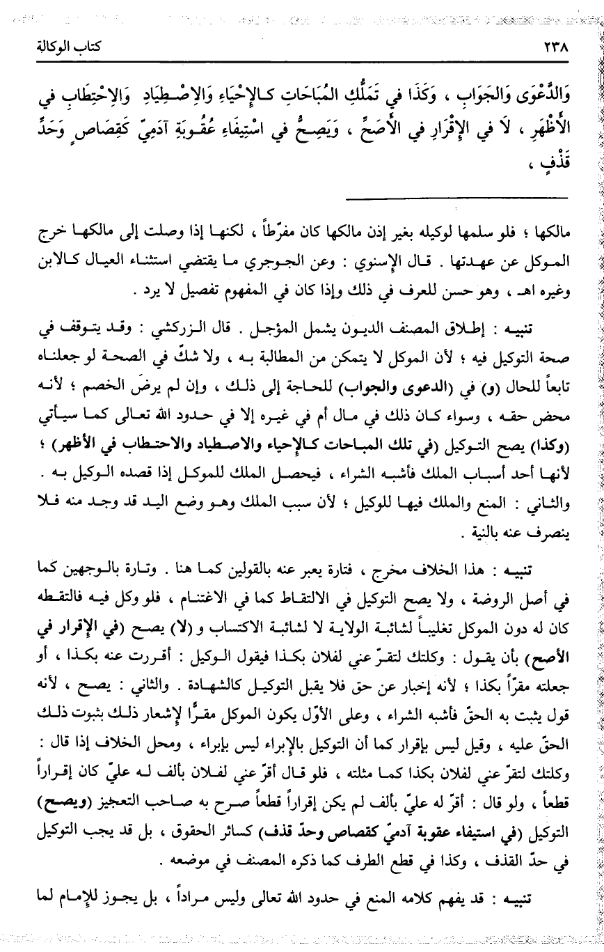 تَنْبِيهٌ إطْلَاقُ الْمُصَنِّفِ الدُّيُونَ يَشْمَلُ الْمُؤَجَّلَ. قَالَ الزَّرْكَشِيُّ: وَقَدْ يَتَوَقَّفُ فِي صِحَّةِ التَّوْكِيلِ فِيهِ؛ لِأَنَّ الْمُوَكِّلَ لَا يَتَمَكَّنُ مِنْ الْمُطَالَبَةِ بِهِ، وَلَا شَكَّ فِي الصِّحَّةِ لَوْ جَعَلْنَاهُ تَابِعًا لِلْحَالِ. (وَ) فِي (الدَّعْوَى وَالْجَوَابِ) لِلْحَاجَةِ إلَى ذَلِكَ، وَإِنْ لَمْ يَرْضَ الْخَصْمُ؛ لِأَنَّهُ مَحْضُ حَقِّهِ، وَسَوَاءٌ كَانَ ذَلِكَ فِي مَالٍ أَمْ فِي غَيْرِهِ إلَّا فِي حُدُودِ اللَّهِ تَعَالَى كَمَا سَيَأْتِي.