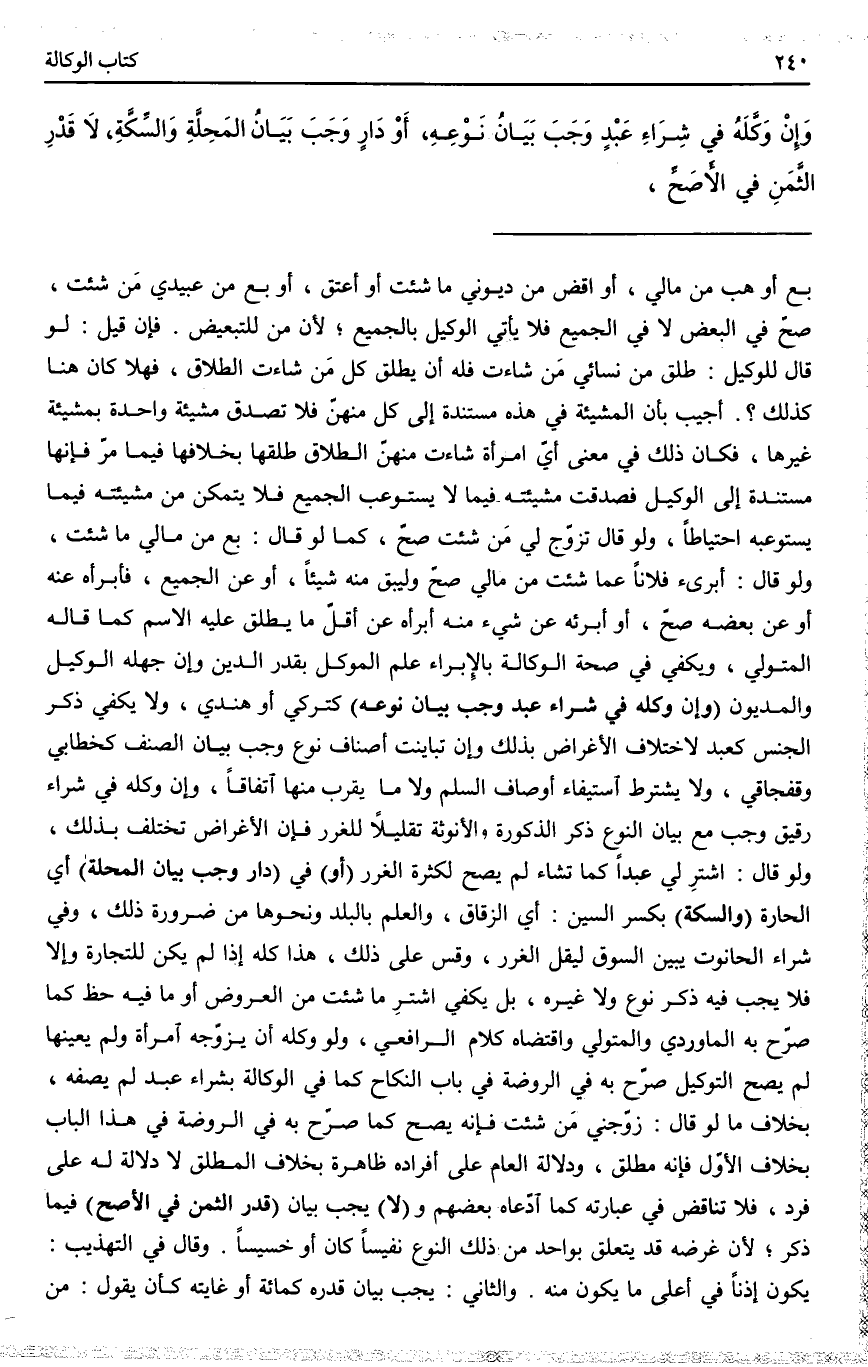 (وَإِنْ وَكَّلَهُ فِي شِرَاءِ عَبْدٍ وَجَبَ بَيَانُ نَوْعِهِ) كَتُرْكِيٍّ أَوْ هِنْدِيٍّ، وَلَا يَكْفِي ذِكْرُ الْجِنْسِ كَعَبْدٍ لِاخْتِلَافِ الْأَغْرَاضِ بِذَلِكَ وَإِنْ تَبَايَنَتْ أَصْنَافُ نَوْعٍ وَجَبَ بَيَانُ الصِّنْفِ كَخَطَابِيٍّ وَقَفْجَاقِيٍّ، وَلَا يُشْتَرَطُ اسْتِيفَاءُ أَوْصَافِ السَّلَمِ وَلَا مَا يَقْرُبُ مِنْهَا اتِّفَاقًا، وَإِنْ وَكَّلَهُ فِي شِرَاءِ رَقِيقٍ وَجَبَ مَعَ بَيَانِ النَّوْعِ ذِكْرُ الذُّكُورَةِ وَالْأُنُوثَةِ تَقْلِيلًا لِلْغَرَرِ فَإِنَّ الْأَغْرَاضَ تَخْتَلِفُ بِذَلِكَ، وَلَوْ قَالَ: اشْتَرِ لِي عَبْدًا كَمَا تَشَاءُ لَمْ يَصِحَّ لِكَثْرَةِ الْغَرَرِ (أَوْ) فِي (دَارٍ وَجَبَ بَيَانُ الْمَحَلَّةِ) أَيْ الْحَارَةِ (وَالسِّكَّةِ) بِكَسْرِ السِّينِ: أَيْ الزُّقَاقِ، وَالْعِلْمُ بِالْبَلَدِ وَنَحْوِهَا مِنْ ضَرُورَةِ ذَلِكَ، وَفِي شِرَاءِ الْحَانُوت يُبَيِّنُ السُّوقَ لِيَقِلَّ الْغَرَرُ، وَقِسْ عَلَى ذَلِكَ هَذَا كُلُّهُ إذَا لَمْ يَكُنْ لِلتِّجَارَةِ وَإِلَّا فَلَا يَجِبُ فِيهِ ذِكْرُ نَوْعٍ وَلَا غَيْرِهِ، بَلْ يَكْفِي اشْتَرِ مَا شِئْت مِنْ الْعُرُوضِ أَوْ مَا فِيهِ حَظٌّ كَمَا صَرَّحَ بِهِ الْمَاوَرْدِيُّ وَالْمُتَوَلِّي وَاقْتَضَاهُ كَلَامُ الرَّافِعِيِّ، وَلَوْ وَكَّلَهُ أَنْ يُزَوِّجَهُ امْرَأَةً وَلَمْ يُعَيِّنْهَا لَمْ يَصِحَّ التَّوْكِيلُ صَرَّحَ بِهِ فِي الرَّوْضَةِ فِي بَابِ النِّكَاحِ كَمَا فِي الْوَكَالَةِ بِشِرَاءٍ عَبْدٍ لَمْ يَصِفْهُ، بِخِلَافِ مَا لَوْ قَالَ: زَوِّجْنِي مَنْ شِئْت فَإِنَّهُ يَصِحُّ كَمَا صَرَّحَ بِهِ فِي الرَّوْضَةِ فِي هَذَا الْبَابِ بِخِلَافِ الْأَوَّلِ فَإِنَّهُ مُطْلَقٌ وَدَلَالَةُ الْعَامِّ عَلَى أَفْرَادِهِ ظَاهِرَةٌ بِخِلَافِ الْمُطْلَقِ لَا دَلَالَةَ لَهُ عَلَى فَرْدٍ، فَلَا تَنَاقُضَ فِي عِبَارَتِهِ كَمَا ادَّعَاهُ بَعْضُهُمْ، وَ (لَا) يَجِبُ بَيَانُ (قَدْرِ الثَّمَنِ فِي الْأَصَحِّ) فِيمَا ذُكِرَ؛ لِأَنَّ غَرَضَهُ قَدْ يَتَعَلَّقُ بِوَاحِدٍ مِنْ ذَلِكَ النَّوْعِ نَفِيسًا كَانَ أَوْ خَسِيسًا. وَقَالَ فِي التَّهْذِيبِ: يَكُونُ إذْنًا فِي أَعْلَى مَا يَكُونُ مِنْهُ. وَالثَّانِي: يَجِبُ بَيَانُ قَدْرِهِ كَمِائَةٍ أَوْ غَايَتِهِ كَأَنْ يَقُولَ مِنْ