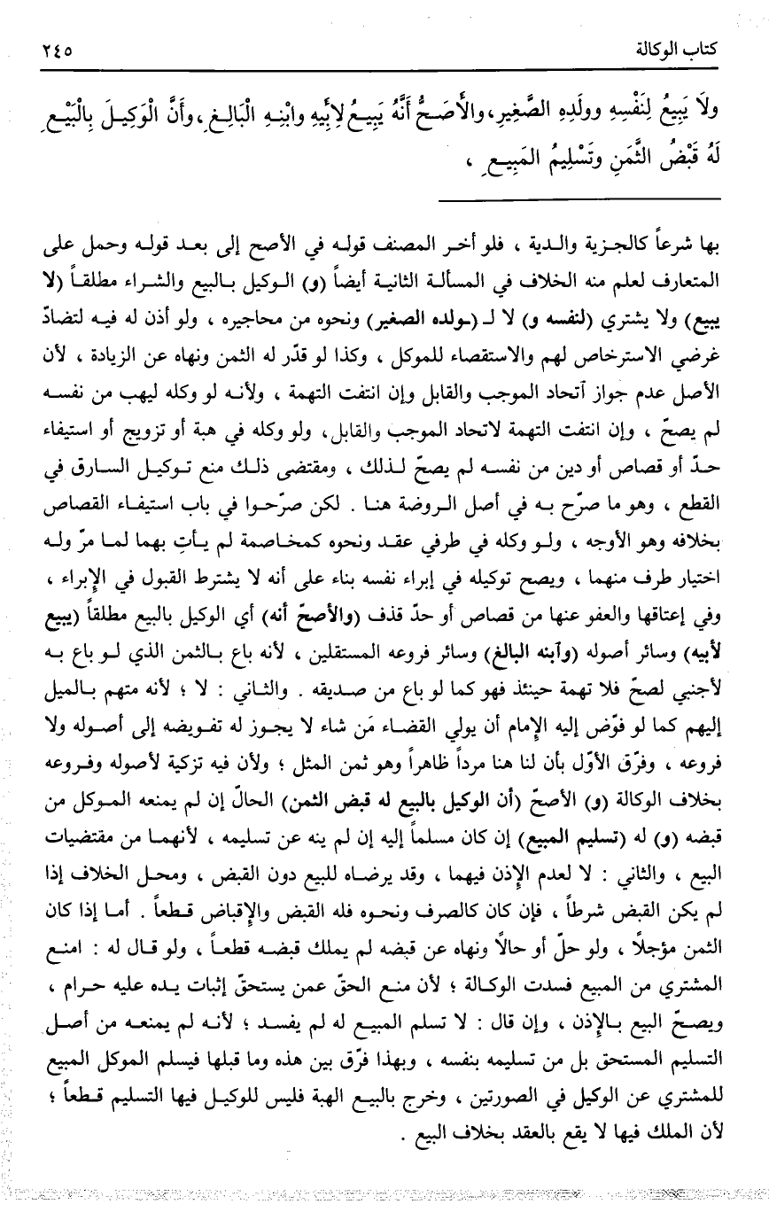 ـــــــــــــــــــــــــــــQبِهَا شَرْعًا كَالْجِزْيَةِ وَالدِّيَةِ، فَلَوْ أَخَّرَ الْمُصَنِّفُ قَوْلَهُ فِي الْأَصَحِّ إلَى بَعْدِ قَوْلِهِ وَحُمِلَ عَلَى الْمُتَعَارَفِ لَعُلِمَ مِنْهُ الْخِلَافُ فِي الْمَسْأَلَةِ الثَّانِيَةِ أَيْضًا (وَ) الْوَكِيلُ بِالْبَيْعِ وَالشِّرَاءِ مُطْلَقًا (لَا يَبِيعُ) وَلَا يَشْتَرِي (لِنَفْسِهِ وَ) لَا (لِوَلَدِهِ الصَّغِيرِ) وَنَحْوِهِ مِنْ مَحَاجِيرِهِ، وَلَوْ أَذِنَ لَهُ فِيهِ لِتَضَادِّ غَرَضَيْ الِاسْتِرْخَاصِ لَهُمْ وَالِاسْتِقْصَاءِ لِلْمُوَكِّلِ، وَكَذَا لَوْ قَدَّرَ لَهُ الثَّمَنَ وَنَهَاهُ عَنْ الزِّيَادَةِ؛ لِأَنَّ الْأَصْلَ عَدَمُ جَوَازِ اتِّحَادِ الْمُوجِبِ وَالْقَابِلِ وَإِنْ انْتَفَتْ التُّهْمَةُ؛ وَلِأَنَّهُ لَوْ وَكَّلَهُ لِيَهَبَ مِنْ نَفْسِهِ لَمْ يَصِحَّ، وَإِنْ انْتَفَتْ التُّهْمَةُ لِاتِّحَادِ الْمُوجِبِ وَالْقَابِلِ، وَلَوْ وَكَّلَهُ فِي هِبَةٍ أَوْ تَزْوِيجٍ أَوْ اسْتِيفَاءِ حَدٍّ أَوْ قِصَاصٍ أَوْ دَيْنٍ مِنْ نَفْسِهِ لَمْ يَصِحَّ لِذَلِكَ، وَمُقْتَضَى ذَلِكَ مَنْعُ تَوْكِيلِ السَّارِقِ فِي الْقَطْعِ، وَهُوَ مَا صَرَّحَ بِهِ فِي أَصْلِ الرَّوْضَةِ هُنَا، لَكِنْ صَرَّحُوا فِي بَابِ اسْتِيفَاءِ الْقِصَاصِ بِخِلَافِهِ وَهُوَ الْأَوْجَهُ، وَلَوْ وَكَّلَهُ فِي طَرَفَيْ عَقْدٍ وَنَحْوِهِ كَمُخَاصَمَةٍ لَمْ يَأْتِ بِهِمَا لِمَا مَرَّ وَلَه اخْتِيَارُ طَرَفٍ مِنْهُمَا، وَيَصِحُّ تَوْكِيلُهُ فِي إبْرَاءِ نَفْسِهِ بِنَاءً عَلَى أَنَّهُ لَا يُشْتَرَطُ الْقَبُولُ فِي الْإِبْرَاءِ، وَفِي إعْتَاقِهَا وَالْعَفْوِ عَنْهَا مِنْ قِصَاصٍ أَوْ حَدِّ قَذْفٍ.