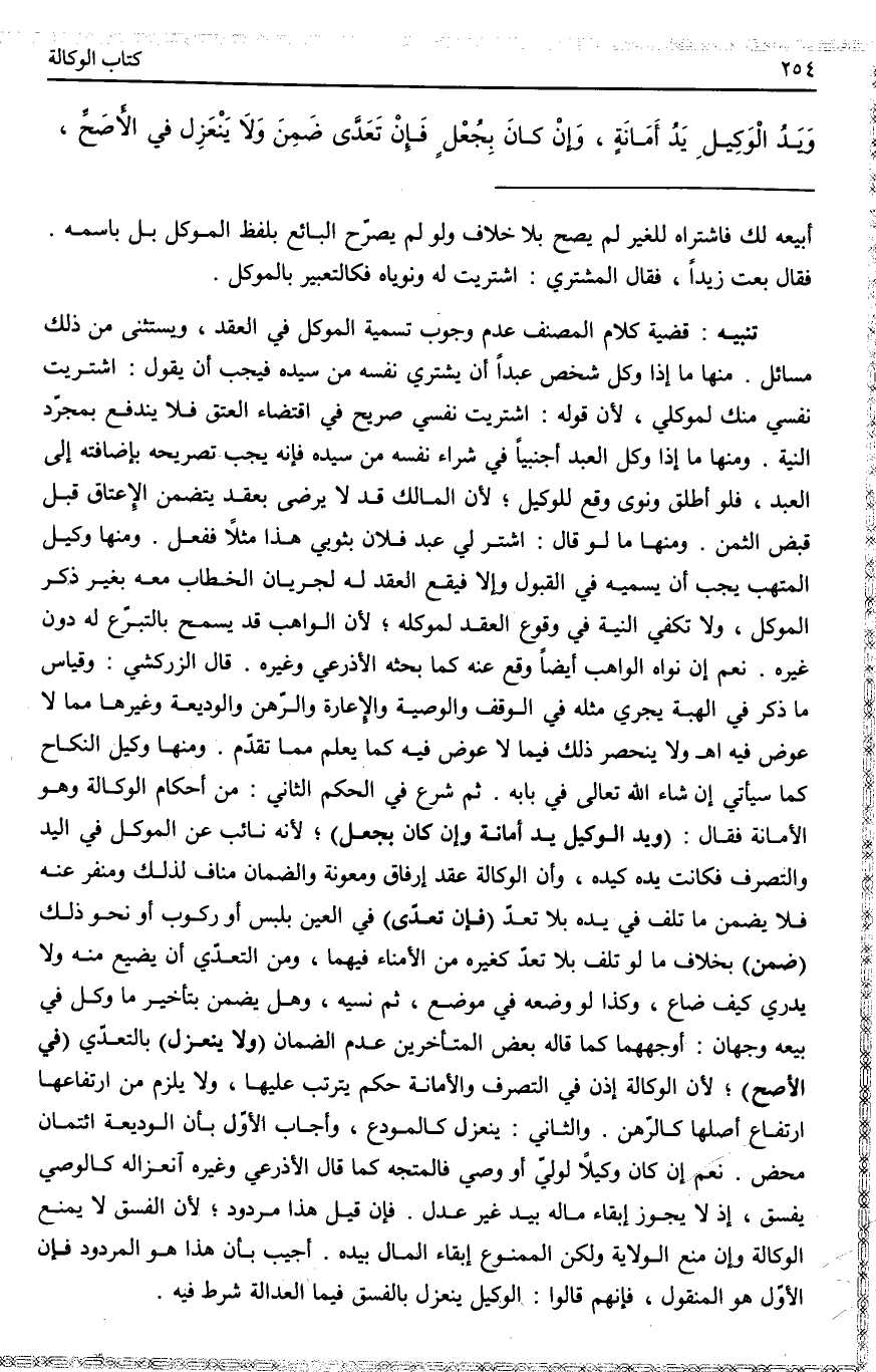ثُمَّ شَرَعَ فِي الْحُكْمِ الثَّانِي مِنْ أَحْكَامِ الْوَكَالَةِ وَهُوَ الْأَمَانَةُ فَقَالَ: (وَيَدُ الْوَكِيلِ يَدُ أَمَانَةٍ، وَإِنْ كَانَ بِجُعْلٍ) لِأَنَّهُ نَائِبٌ عَنْ الْمُوَكِّلِ فِي الْيَدِ وَالتَّصَرُّفِ فَكَانَتْ يَدُهُ كَيَدِهِ، وَأَنَّ الْوَكَالَةَ عَقْدُ إرْفَاقٍ وَمَعُونَةٍ وَالضَّمَانُ مُنَافٍ لِذَلِكَ وَمُنَفِّرٌ عَنْهُ فَلَا يَضْمَنُ مَا تَلَفَ فِي يَدِهِ بِلَا تَعَدٍّ.