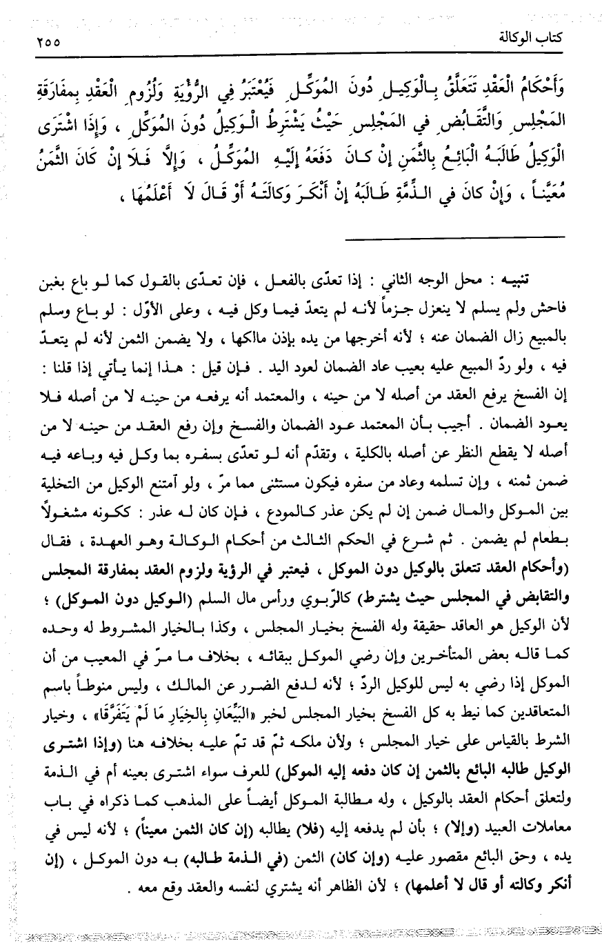 ثُمَّ شَرَعَ فِي الْحُكْمِ الثَّالِثِ مِنْ أَحْكَامِ الْوَكَالَةِ وَهُوَ الْعُهْدَةُ، فَقَالَ (وَأَحْكَامُ الْعَقْدِ تَتَعَلَّقُ بِالْوَكِيلِ دُونَ الْمُوَكِّلِ، فَيُعْتَبَرُ فِي الرُّؤْيَةِ وَلُزُومِ الْعَقْدِ بِمُفَارَقَةِ الْمَجْلِسِ وَالتَّقَابُضِ فِي الْمَجْلِسِ حَيْثُ يَشْتَرِطُ) كَالرِّبَوِيِّ وَرَأْسِ مَالِ السَّلَمِ (الْوَكِيلُ دُونَ الْمُوَكِّلِ) ؛ لِأَنَّ الْوَكِيلَ هُوَ الْعَاقِدُ حَقِيقَةً وَلَهُ الْفَسْخُ بِخِيَارِ الْمَجْلِسِ، وَكَذَا بِالْخِيَارِ الْمَشْرُوطِ لَهُ وَحْدَهُ كَمَا قَالَهُ بَعْضُ الْمُتَأَخِّرِينَ، وَإِنْ رَضِيَ الْمُوَكِّلُ بِبَقَائِهِ، بِخِلَافِ مَا مَرَّ فِي الْمَعِيبِ مِنْ أَنَّ الْمُوَكِّلَ إذَا رَضِيَ بِهِ لَيْسَ لِلْوَكِيلِ الرَّدُّ؛ لِأَنَّهُ لِدَفْعِ الضَّرَرِ عَنْ الْمَالِكِ، وَلَيْسَ مَنُوطًا بِاسْمِ الْمُتَعَاقِدَيْنِ كَمَا نِيطَ بِهِ كُلُّ الْفَسْخِ بِخِيَارِ الْمَجْلِسِ لِخَبَرِ «الْبَيِّعَانِ بِالْخِيَارِ مَا لَمْ يَتَفَرَّقَا» ، وَخِيَارُ الشَّرْطِ بِالْقِيَاسِ عَلَى خِيَارِ الْمَجْلِسِ؛ وَلِأَنَّ مِلْكَهُ ثَمَّ قَدْ تَمَّ عَلَيْهِ بِخِلَافِهِ هُنَا (وَإِذَا اشْتَرَى الْوَكِيلُ طَالَبَهُ الْبَائِعُ بِالثَّمَنِ إنْ كَانَ دَفَعَهُ إلَيْهِ الْمُوَكِّلُ) لِلْعُرْفِ سَوَاءٌ اشْتَرَى بِعَيْنِهِ أَمْ فِي الذِّمَّةِ وَلِتَعَلُّقِ أَحْكَامِ الْعَقْدِ بِالْوَكِيلِ، وَلَهُ مُطَالَبَةُ الْمُوَكِّلِ أَيْضًا عَلَى الْمَذْهَبِ كَمَا ذَكَرَاهُ فِي بَابِ مُعَامَلَاتِ الْعَبِيدِ (وَإِلَّا) ؛ بِأَنَّ لَمْ يَدْفَعْهُ إلَيْهِ (فَلَا) يُطَالِبُهُ (إنْ كَانَ الثَّمَنُ مُعَيَّنًا) ؛ لِأَنَّهُ لَيْسَ فِي يَدِهِ وَحَقُّ الْبَائِعِ مَقْصُورٌ عَلَيْهِ (وَإِنْ كَانَ) الثَّمَنُ (فِي الذِّمَّةِ طَالَبَهُ) بِهِ دُونَ الْمُوَكِّلِ.