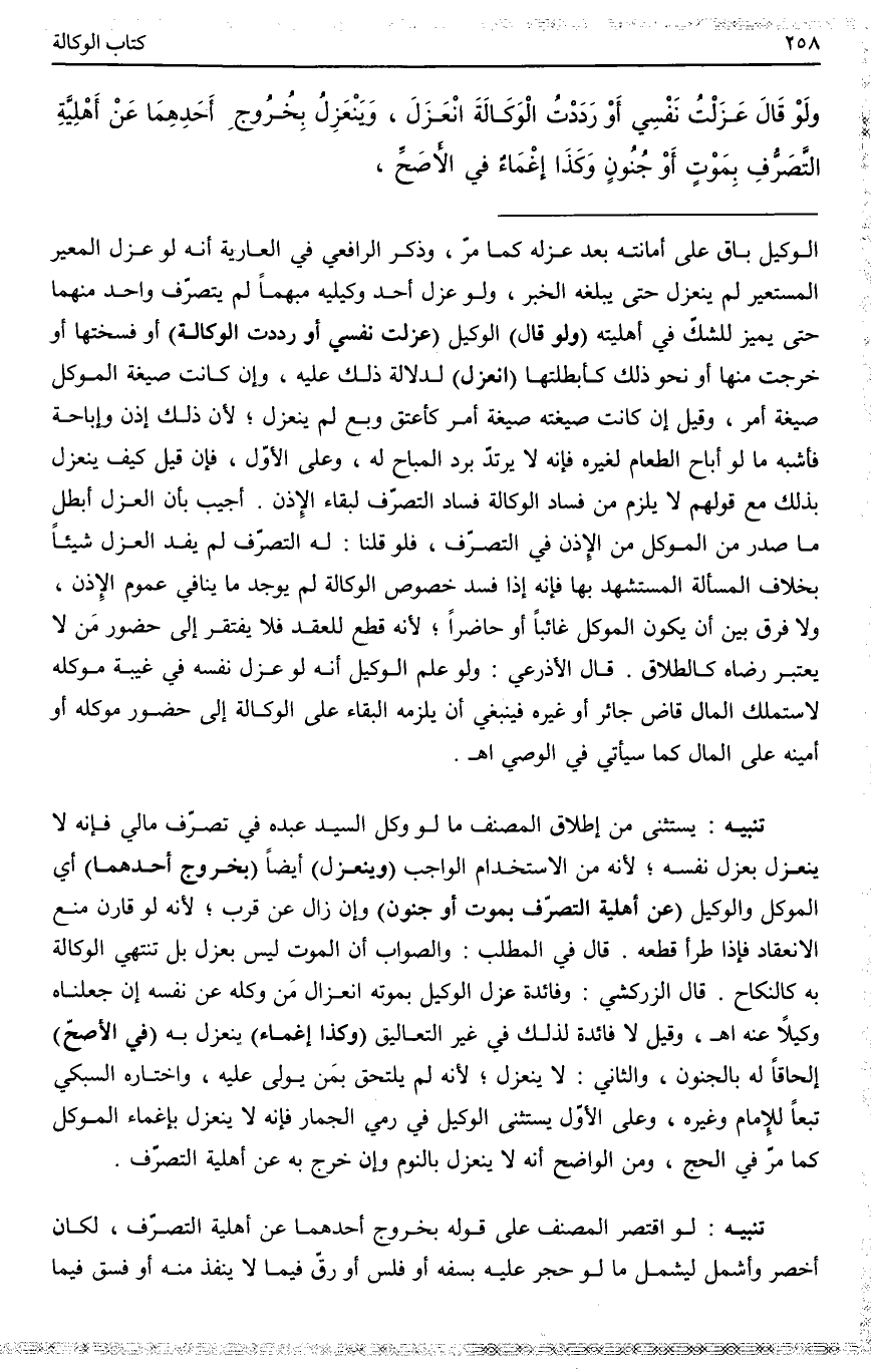 تَنْبِيهٌ يُسْتَثْنَى مِنْ إطْلَاقِ الْمُصَنِّفِ مَا لَوْ وَكَّلَ السَّيِّدُ عَبْدَهُ فِي تَصَرُّفٍ مَالِيٍّ فَإِنَّهُ لَا يَنْعَزِلُ بِعَزْلِ نَفْسِهِ؛ لِأَنَّهُ مِنْ الِاسْتِخْدَامِ الْوَاجِبِ (وَيَنْعَزِلُ) أَيْضًا (بِخُرُوجِ أَحَدِهِمَا) أَيْ الْمُوَكِّلِ وَالْوَكِيلِ (عَنْ أَهْلِيَّةِ التَّصَرُّفِ بِمَوْتٍ أَوْ جُنُونٍ) ، وَإِنْ زَالَ عَنْ قُرْبٍ؛ لِأَنَّهُ لَوْ قَارَنَ مَنَعَ الِانْعِقَادَ فَإِذَا طَرَأَ قَطَعَهُ. قَالَ فِي الْمَطْلَبِ: وَالصَّوَابُ أَنَّ الْمَوْتَ لَيْسَ بِعَزْلٍ، بَلْ تَنْتَهِي الْوَكَالَةُ بِهِ كَالنِّكَاحِ.