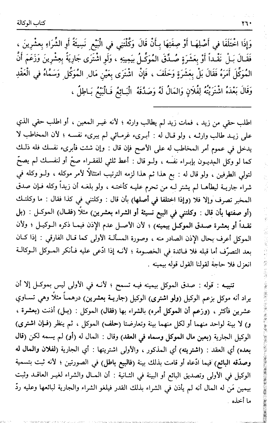 (وَإِذَا اخْتَلَفَا فِي أَصْلِهَا) بِأَنْ قَالَ: وَكَّلْتنِي فِي كَذَا فَقَالَ: مَا وَكَّلْتُك (أَوْ صِفَتِهَا بِأَنْ قَالَ: وَكَّلْتنِي فِي الْبَيْعِ نَسِيئَةً أَوْ الشِّرَاءِ بِعِشْرِينَ) مَثَلًا (فَقَالَ) الْمُوَكِّلُ: (بَلْ نَقْدًا أَوْ بِعَشَرَةٍ صُدِّقَ الْمُوَكِّلُ بِيَمِينِهِ) ؛ لِأَنَّ الْأَصْلَ عَدَمُ الْإِذْنِ فِيمَا ذَكَرَهُ الْوَكِيلُ؛ وَلِأَنَّ الْمُوَكِّلَ أَعْرَفُ بِحَالِ الْإِذْنِ الصَّادِرِ مِنْهُ، وَصُورَةُ الْمَسْأَلَةِ الْأُولَى كَمَا قَالَ الْفَارِقِيُّ: إذَا كَانَ بَعْدَ التَّصَرُّفِ أَمْ قَبْلَهُ فَلَا فَائِدَةَ فِي الْخُصُومَةِ؛ لِأَنَّهُ إذَا ادَّعَى عَلَيْهِ فَأَنْكَرَ الْمُوَكِّلُ الْوَكَالَةَ انْعَزَلَ فَلَا حَاجَةَ لِقَوْلِنَا: الْقَوْلُ قَوْلُهُ بِيَمِينِهِ.