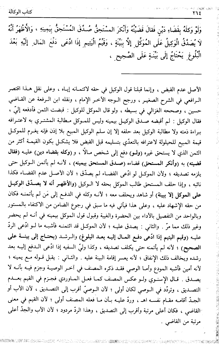 (وَلَوْ) دَفَعَ إلَى شَخْصٍ مَالًا، وَ (وَكَّلَهُ بِقَضَاءِ دَيْنٍ) عَلَيْهِ (فَقَالَ قَضَيْته) بِهِ (وَأَنْكَرَ الْمُسْتَحِقُّ) قَضَاءَهُ (صُدِّقَ الْمُسْتَحِقُّ بِيَمِينِهِ) لِأَنَّهُ لَمْ يَأْتَمِنْ الْوَكِيلَ حَتَّى يَلْزَمَهُ تَصْدِيقُهُ؛ وَلِأَنَّ الْمُوَكِّلَ لَوْ ادَّعَى الْقَضَاءَ لَمْ يُصَدَّقْ؛ لِأَنَّ الْأَصْلَ عَدَمُ الْقَضَاءِ فَكَذَا نَائِبُهُ، وَإِذَا حَلَفَ الْمُسْتَحِقُّ طَالَبَ الْمُوَكِّلَ بِحَقِّهِ لَا الْوَكِيلَ (وَالْأَظْهَرُ أَنَّهُ لَا يُصَدَّقُ الْوَكِيلُ عَلَى الْمُوَكِّلِ إلَّا بِبَيِّنَةٍ) أَوْ شَاهِدٍ وَيَحْلِفُ مَعَهُ؛ لِأَنَّهُ وَكَّلَهُ فِي الدَّفْعِ إلَى مَنْ لَمْ يَأْتَمِنْهُ فَكَانَ مِنْ حَقِّهِ الْإِشْهَادُ عَلَيْهِ، وَعَلَى هَذَا فَيَأْتِي فِيهِ مَا سَبَقَ فِي رُجُوعِ الضَّامِنِ مِنْ الِاكْتِفَاءِ بِالْمَسْتُورِ وَبِالْوَاحِدِ وَمِنْ التَّفْصِيلِ بِالْأَدَاءِ بَيْن الْحَضْرَةِ وَالْغَيْبَةِ وَقَبُولِ قَوْلِ الْمُوَكِّلِ بِيَمِينِهِ فِي أَنَّهُ لَمْ يَحْضُرْ وَغَيْرِ ذَلِكَ مِمَّا مَرَّ. وَالثَّانِي: يُصَدَّقُ عَلَيْهِ؛ لِأَنَّ الْمُوَكِّلَ قَدْ ائْتَمَنَهُ فَأَشْبَهَ مَا لَوْ ادَّعَى الرَّدَّ عَلَيْهِ.