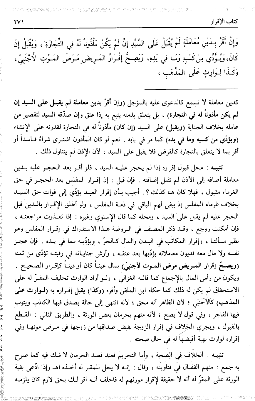 تَنْبِيهٌ مَحَلُّ قَبُولِ إقْرَارِهِ إذَا لَمْ يَحْجُرْ عَلَيْهِ السَّيِّدُ، فَلَوْ أَقَرَّ بَعْدَ الْحَجْرِ عَلَيْهِ بِدَيْنِ مُعَامَلَةٍ أَضَافَهُ إلَى الْآذِنِ لَمْ تُقْبَلْ إضَافَتُهُ. فَإِنْ قِيلَ: إنَّ إقْرَارَ الْمُفْلِسِ بَعْدَ الْحَجْرِ فِي حَقِّ الْغُرَمَاء مَقْبُولٌ، فَهَلَّا كَانَ هُنَا كَذَلِكَ؟ . .