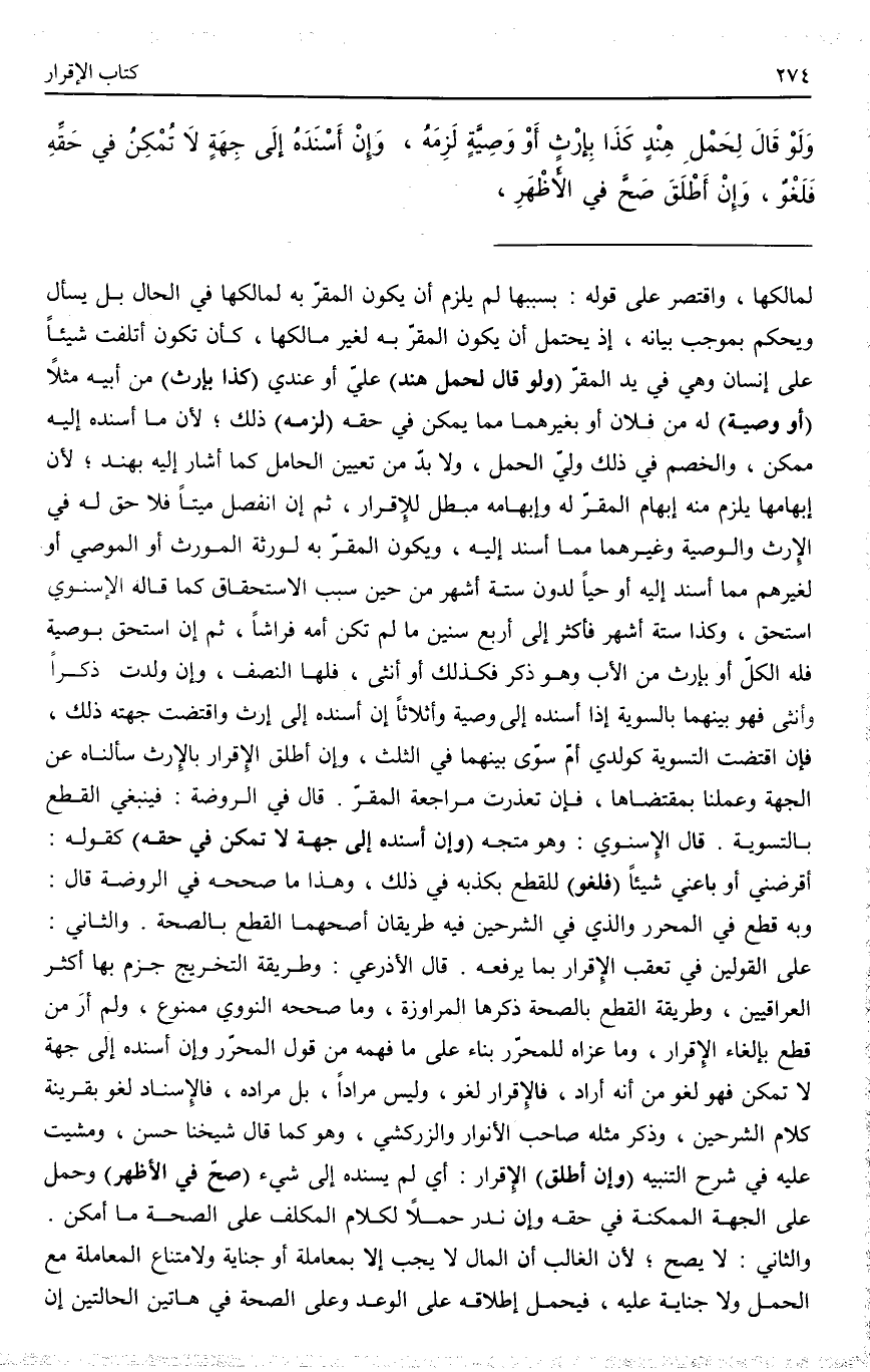 (وَلَوْ قَالَ لِحَمْلِ هِنْدٍ) عَلَيَّ أَوْ عِنْدِي (كَذَا بِإِرْثٍ) مِنْ أَبِيهِ مَثَلًا (أَوْ وَصِيَّةٍ) لَهُ مِنْ فُلَانٍ أَوْ بِغَيْرِهِمَا مِمَّا يُمْكِنُ فِي حَقِّهِ (لَزِمَهُ) ذَلِكَ؛ لِأَنَّ مَا أَسْنَدَهُ إلَيْهِ مُمْكِنٌ وَالْخَصْمُ فِي ذَلِكَ وَلِيُّ الْحَمْلِ، وَلَا بُدَّ مِنْ تَعْيِينِ الْحَامِلِ كَمَا أَشَارَ إلَيْهِ بِهِنْدٍ؛ لِأَنَّ إبْهَامَهَا يَلْزَمُ مِنْهُ إبْهَامُ الْمُقَرِّ لَهُ وَإِبْهَامُهُ مُبْطِلٌ لِلْإِقْرَارِ، ثُمَّ إنْ انْفَصَلَ مَيِّتًا فَلَا حَقَّ لَهُ فِي الْإِرْثِ وَالْوَصِيَّةِ وَغَيْرِهِمَا مِمَّا أُسْنِدَ إلَيْهِ وَيَكُونُ الْمُقَرُّ بِهِ لِوَرَثَةِ الْمُوَرِّثِ أَوْ الْمُوصِي أَوْ لِغَيْرِهِمْ مِمَّا أُسْنِدَ إلَيْهِ أَوْ حَيًّا لِدُونِ سِتَّةِ أَشْهُرٍ مِنْ حِينِ سَبَبِ الِاسْتِحْقَاقِ كَمَا قَالَهُ الْإِسْنَوِيُّ اسْتَحَقَّ، وَكَذَا سِتَّةُ أَشْهُرٍ فَأَكْثَرُ إلَى أَرْبَعِ سِنِينَ مَا لَمْ تَكُنْ أُمُّهُ فِرَاشًا، ثُمَّ إنْ اسْتَحَقَّ بِوَصِيَّةٍ فَلَهُ الْكُلُّ أَوْ بِإِرْثٍ مِنْ الْأَبِ وَهُوَ ذَكَرٌ فَكَذَلِكَ أَوْ أُنْثَى، فَلَهَا النِّصْفُ، وَإِنْ وَلَدَتْ ذَكَرًا وَأُنْثَى فَهُوَ بَيْنَهُمَا بِالسَّوِيَّةِ إذَا أَسْنَدَهُ إلَى وَصِيَّةٍ وَأَثْلَاثًا إنْ أَسْنَدَهُ إلَى إرْثٍ وَاقْتَضَتْ جِهَتُهُ ذَلِكَ، فَإِنْ اقْتَضَتْ التَّسْوِيَةَ كَوَلَدَيْ أُمٍّ سَوَّى بَيْنَهُمَا فِي الثُّلُثِ، وَإِنْ أَطْلَقَ الْإِقْرَارَ بِالْإِرْثِ سَأَلْنَاهُ عَنْ الْجِهَةِ وَعَمِلْنَا بِمُقْتَضَاهَا، فَإِنْ تَعَذَّرَتْ مُرَاجَعَةُ الْمُقِرِّ. قَالَ فِي الرَّوْضَةِ: فَيَنْبَغِي الْقَطْعُ بِالتَّسْوِيَةِ قَالَ الْإِسْنَوِيُّ: وَهُوَ مُتَّجَهٌ (وَإِنْ أَسْنَدَهُ إلَى جِهَةٍ لَا تُمْكِنُ فِي حَقِّهِ) كَقَوْلِهِ أَقْرَضَنِي أَوْ بَاعَنِي شَيْئًا (فَلَغْوٌ) لِلْقَطْعِ بِكِذْبِهِ فِي ذَلِكَ، وَهَذَا مَا صَحَّحَهُ فِي الرَّوْضَةِ قَالَ: وَبِهِ قَطَعَ فِي الْمُحَرَّرِ وَاَلَّذِي فِي الشَّرْحَيْنِ فِيهِ طَرِيقَانِ أَصَحُّهُمَا الْقَطْعُ بِالصِّحَّةِ. وَالثَّانِي عَلَى الْقَوْلَيْنِ فِي تَعَقُّبِ الْإِقْرَارِ بِمَا يَرْفَعُهُ. قَالَ الْأَذْرَعِيُّ: وَطَرِيقَةُ التَّخْرِيجِ جَزَمَ بِهَا أَكْثَرُ الْعِرَاقِيِّينَ، وَطَرِيقَةُ الْقَطْعِ بِالصِّحَّةِ ذَكَرَهَا الْمَرَاوِزَةُ، وَمَا صَحَّحَهُ النَّوَوِيُّ مَمْنُوعٌ، وَلَمْ أَرَ مَنْ قَطَعَ بِإِلْغَاءِ الْإِقْرَارِ، وَمَا عَزَاهُ لِلْمُحَرَّرِ بِنَاءً عَلَى مَا فَهِمَهُ مِنْ قَوْلِ الْمُحَرَّرِ وَإِنْ أَسْنَدَهُ إلَى جِهَةٍ لَا تُمْكِنُ فَهُوَ لَغْوٌ مِنْ أَنَّهُ أَرَادَ، فَالْإِقْرَارُ لَغْوٌ، وَلَيْسَ مُرَادًا، بَلْ مُرَادُهُ، فَالْإِسْنَادُ لَغْوٌ بِقَرِينَةِ كَلَامِ الشَّرْحَيْنِ، وَذَكَرَ مِثْلَهُ صَاحِبُ الْأَنْوَارِ وَالزَّرْكَشِيُّ، وَهُوَ كَمَا قَالَ شَيْخُنَا حَسَنٌ وَمَشَيْت عَلَيْهِ فِي شَرْحِ التَّنْبِيهِ.