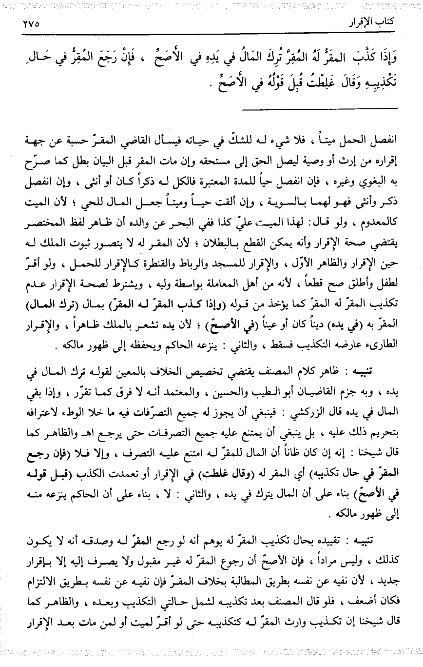 ـــــــــــــــــــــــــــــQانْفَصَلَ الْحَمْلُ مَيِّتًا فَلَا شَيْءَ لَهُ لِلشَّكِّ فِي حَيَاتِهِ فَيَسْأَلُ الْقَاضِي الْمُقِرَّ حِسْبَةً عَنْ جِهَةِ إقْرَارِهِ مِنْ إرْثٍ أَوْ وَصِيَّةٍ لِيَصِلَ الْحَقُّ إلَى مُسْتَحِقِّهِ وَإِنْ مَاتَ الْمُقِرُّ قَبْلَ الْبَيَانِ بَطَلَ كَمَا صَرَّحَ بِهِ الْبَغَوِيّ وَغَيْرُهُ، فَإِنْ انْفَصَلَ حَيًّا لِلْمُدَّةِ الْمُعْتَبَرَةِ فَالْكُلُّ لَهُ ذَكَرًا كَانَ أَوْ أُنْثَى، وَإِنْ انْفَصَلَ ذَكَرٌ وَأُنْثَى فَهُوَ لَهُمَا بِالسَّوِيَّةِ، وَإِنْ أَلْقَتْ حَيًّا وَمَيِّتًا جُعِلَ الْمَالُ لِلْحَيِّ؛ لِأَنَّ الْمَيِّتَ كَالْمَعْدُومِ، وَلَوْ قَالَ: لِهَذَا الْمَيِّتِ عَلَيَّ كَذَا فَفِي الْبَحْرِ عَنْ وَالِدِهِ أَنَّ ظَاهِرَ لَفْظِ الْمُخْتَصَرِ يَقْتَضِي صِحَّةَ الْإِقْرَارِ وَأَنَّهُ يُمْكِنُ الْقَطْعُ بِالْبُطْلَانِ؛ لِأَنَّ الْمُقَرَّ لَهُ لَا يُتَصَوَّرُ ثُبُوتُ الْمِلْكِ لَهُ حِينَ الْإِقْرَارِ وَالظَّاهِرُ الْأَوَّلُ، وَالْإِقْرَارُ لِلْمَسْجِدِ وَالرِّبَاطِ وَالْقَنْطَرَةُ كَالْإِقْرَارِ لِلْحَمْلِ، وَلَوْ أَقَرَّ لِطِفْلٍ وَأَطْلَقَ صَحَّ قَطْعًا؛ لِأَنَّهُ مِنْ أَهْلِ الْمُعَامَلَةِ بِوَاسِطَةِ وَلِيِّهِ.