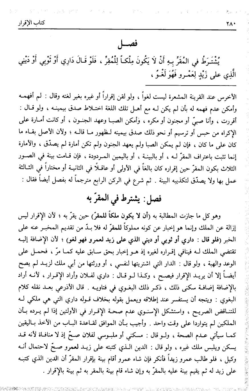 [فَصْلٌ يُشْتَرَطُ فِي الْمُقَرِّ بِهِ أَنْ لَا يَكُونَ مِلْكًا لِلْمُقِرِّ]