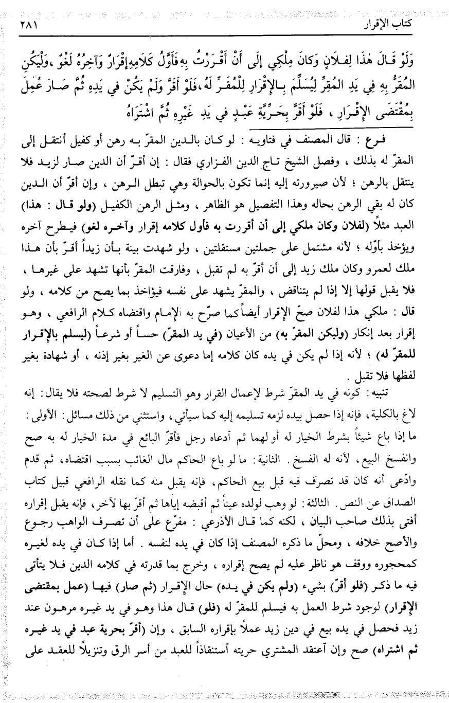 تَنْبِيهٌ كَوْنُهُ فِي يَدِ الْمُقِرِّ شَرْطٌ لِإِعْمَالِ الْقَرَارِ، وَهُوَ التَّسْلِيمُ لَا شَرْطٌ لِصِحَّتِهِ فَلَا يُقَالُ: إنَّهُ لَاغٍ بِالْكُلِّيَّةِ، فَإِنَّهُ إذَا حَصَلَ بِيَدِهِ لَزِمَهُ تَسْلِيمُهُ إلَيْهِ كَمَا سَيَأْتِي.
