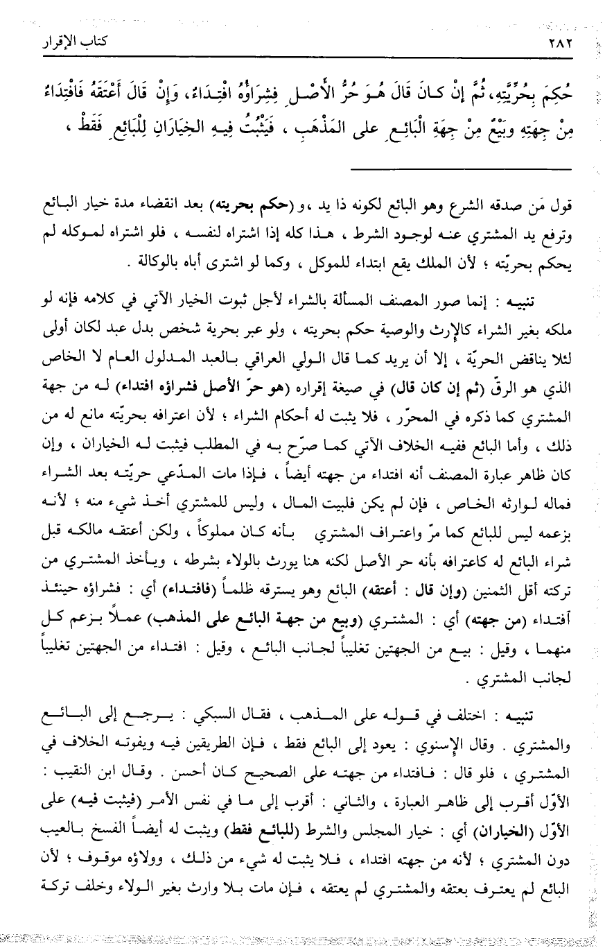 (ثُمَّ إنْ كَانَ قَالَ) فِي صِيغَةِ إقْرَارِهِ (هُوَ حُرُّ الْأَصْلِ فَشِرَاؤُهُ افْتِدَاءٌ) لَهُ مِنْ جِهَةِ الْمُشْتَرِي كَمَا ذَكَرَهُ فِي الْمُحَرَّرِ، فَلَا يَثْبُتُ لَهُ أَحْكَامُ الشِّرَاءِ؛ لِأَنَّ اعْتِرَافَهُ بِحُرِّيَّتِهِ مَانِعٌ لَهُ مِنْ ذَلِكَ، وَأَمَّا الْبَائِعُ، فَفِيهِ الْخِلَافُ الْآتِي كَمَا صَرَّحَ بِهِ فِي الْمَطْلَبِ، فَيَثْبُتُ لَهُ الْخِيَارَانِ، وَإِنْ كَانَ ظَاهِرُ عِبَارَةِ الْمُصَنِّفِ أَنَّهُ افْتِدَاءٌ مِنْ جِهَتِهِ أَيْضًا، فَإِذَا مَاتَ الْمُدَّعَى حُرِّيَّتَهُ بَعْدَ الشِّرَاءِ فَمَالُهُ لِوَارِثِهِ الْخَاصِّ، فَإِنْ لَمْ يَكُنْ فَلِبَيْتِ الْمَالِ، وَلَيْسَ لِلْمُشْتَرِي أَخْذُ شَيْءٍ مِنْهُ؛ لِأَنَّهُ بِزَعْمِهِ لَيْسَ لِلْبَائِعِ كَمَا مَرَّ وَاعْتِرَافِ الْمُشْتَرِي بِأَنَّهُ كَانَ مَمْلُوكًا، وَلَكِنْ أَعْتَقَهُ مَالِكُهُ قَبْلَ شِرَاءِ الْبَائِعِ لَهُ كَاعْتِرَافِهِ بِأَنَّهُ حُرُّ الْأَصْلِ لَكِنَّهُ هُنَا يُوَرَّثُ بِالْوَلَاءِ بِشَرْطِهِ، وَيَأْخُذُ الْمُشْتَرِي مِنْ تَرِكَتِهِ أَقَلَّ الثَّمَنَيْنِ (وَإِنْ قَالَ: أَعْتَقَهُ) الْبَائِعُ وَهُوَ يَسْتَرِقُّهُ ظُلْمًا (فَافْتِدَاءٌ) أَيْ: فَشِرَاؤُهُ حِينَئِذٍ افْتِدَاءٌ (مِنْ جِهَتِهِ) أَيْ: الْمُشْتَرِي (وَبَيْعٌ مِنْ جِهَةِ الْبَائِعِ عَلَى الْمَذْهَبِ) عَمَلًا بِزَعْمِ كُلٍّ مِنْهُمَا، وَقِيلَ: بَيْعٌ مِنْ الْجِهَتَيْنِ تَغْلِيبًا لِجَانِبِ الْبَائِعِ، وَقِيلَ: افْتِدَاءٌ مِنْ الْجِهَتَيْنِ تَغْلِيبًا لِجَانِبِ الْمُشْتَرِي.