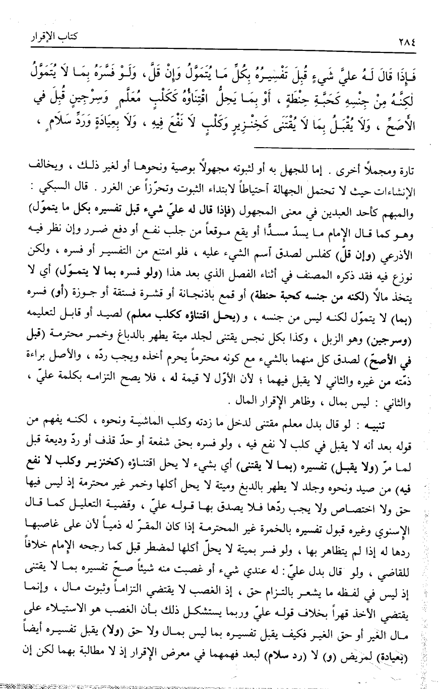 ـــــــــــــــــــــــــــــQتَارَةً، وَمُجْمَلًا أُخْرَى. إمَّا لِلْجَهْلِ بِهِ أَوْ لِثُبُوتِهِ مَجْهُولًا بِوَصِيَّةٍ وَنَحْوِهَا أَوْ لِغَيْرِ ذَلِكَ، وَيُخَالِفُ الْإِنْشَاءَاتِ حَيْثُ لَا تَحْتَمِلُ الْجَهَالَةَ احْتِيَاطًا لِابْتِدَاءِ الثُّبُوتِ، وَتَحَرُّزًا عَنْ الْغَرَرِ قَالَ السُّبْكِيُّ: وَالْمُبْهَمُ كَأَحَدِ الْعَبْدَيْنِ فِي مَعْنَى الْمَجْهُولِ (فَإِذَا قَالَ لَهُ: عَلَيَّ شَيْءٌ قُبِلَ تَفْسِيرُهُ بِكُلِّ مَا يُتَمَوَّلُ) وَهُوَ كَمَا قَالَ الْإِمَامُ مَا يَسُدُّ مَسَدًّا أَوْ يَقَعُ مَوْقِعًا مِنْ جَلْبِ نَفْعٍ أَوْ دَفْعِ ضَرَرٍ، وَإِنْ نَظَرَ فِيهِ الْأَذْرَعِيُّ (وَإِنْ قَلَّ) كَفَلْسٍ لِصِدْقِ اسْمِ الشَّيْءِ عَلَيْهِ فَلَوْ امْتَنَعَ مِنْ التَّفْسِيرِ أَوْ فَسَّرَهُ، وَلَكِنْ نُوزِعَ فِيهِ فَقَدْ ذَكَرَهُ الْمُصَنِّفُ فِي أَثْنَاءِ الْفَصْلِ الَّذِي بَعْدَ هَذَا (وَلَوْ فَسَّرَهُ بِمَا لَا يُتَمَوَّلُ) أَيْ: لَا يُتَّخَذُ مَالًا (لَكِنَّهُ مِنْ جِنْسِهِ كَحَبَّةِ حِنْطَةٍ) أَوْ قِمْعِ بَاذِنْجَانَةٍ أَوْ قِشْرَةِ فُسْتُقَةٍ أَوْ جَوْزَةٍ (أَوْ) فَسَّرَهُ (بِمَا) لَا يُتَمَوَّلُ لَكِنَّهُ لَيْسَ مِنْ جِنْسِهِ، وَ (يَحِلُّ اقْتِنَاؤُهُ كَكَلْبٍ مُعَلَّمٍ) لِصَيْدٍ أَوْ قَابِلٍ لِتَعْلِيمِهِ (وَسِرْجِينٍ) وَهُوَ الزِّبْلُ، وَكَذَا بِكُلِّ نَجِسٍ يُقْتَنَى كَجِلْدِ مَيْتَةٍ يَطْهُرُ بِالدِّبَاغِ وَخَمْرٍ مُحْتَرَمَةٍ (قُبِلَ فِي الْأَصَحِّ) لِصِدْقِ كُلٍّ مِنْهُمَا بِالشَّيْءِ مَعَ كَوْنِهِ مُحْتَرَمًا يَحْرُمُ أَخْذُهُ، وَيَجِبُ رَدُّهُ وَالْأَصْلُ بَرَاءَةُ ذِمَّتِهِ مِنْ غَيْرِهِ، وَالثَّانِي لَا يُقْبَلُ فِيهِمَا؛ لِأَنَّ الْأَوَّلَ لَا قِيمَةَ لَهُ، فَلَا يَصِحُّ الْتِزَامُهُ بِكَلِمَةِ عَلَيَّ، وَالثَّانِي: لَيْسَ بِمَالٍ، وَظَاهِرُ الْإِقْرَارِ الْمَالُ.