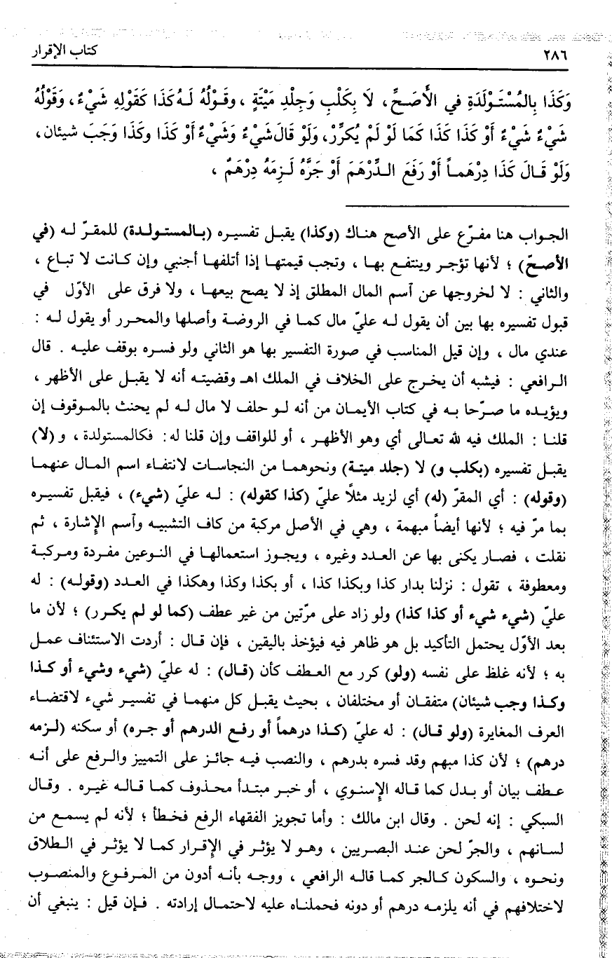 وَقَالَ السُّبْكِيُّ: إنَّهُ لَحْنٌ. وَقَالَ ابْنُ مَالِكٍ: وَأَمَّا تَجْوِيزُ الْفُقَهَاءِ الرَّفْعَ فَخَطَأٌ؛ لِأَنَّهُ لَمْ يُسْمَعْ مِنْ لِسَانِهِمْ، وَالْجَرُّ لَحْنٌ عِنْدَ الْبَصْرِيِّينَ وَهُوَ لَا يُؤَثِّرُ فِي الْإِقْرَارِ كَمَا لَا يُؤَثِّرُ فِي الطَّلَاقِ وَنَحْوِهِ، وَالسُّكُونُ كَالْجَرِّ كَمَا قَالَهُ الرَّافِعِيُّ، وَوَجْهٌ بِأَنَّهُ أَدْوَنُ مِنْ الْمَرْفُوعِ، وَالْمَنْصُوبِ لِاخْتِلَافِهِمْ فِي أَنَّهُ يَلْزَمُهُ دِرْهَمٌ أَوْ دُونَهُ، فَحَمَلْنَاهُ عَلَيْهِ لِاحْتِمَالِ إرَادَتِهِ فَإِنْ قِيلَ: يَنْبَغِي أَنْ