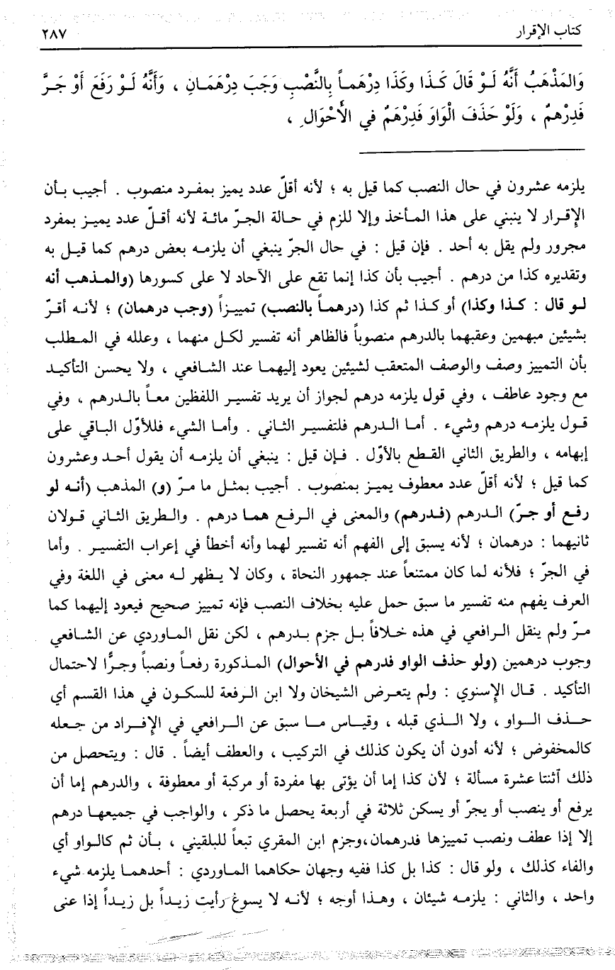 وَالْمَذْهَبُ أَنَّهُ لَوْ قَالَ كَذَا وَكَذَا دِرْهَمًا بِالنَّصْبِ وَجَبَ دِرْهَمَانِ، وَأَنَّهُ لَوْ رَفَعَ أَوْ جَرَّ فَدِرْهَمٌ، وَلَوْ حَذَفَ الْوَاوَ فَدِرْهَمٌ فِي الْأَحْوَالِ.