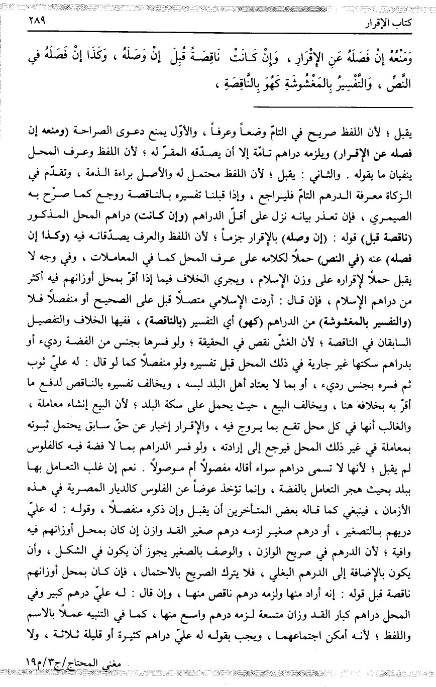 ـــــــــــــــــــــــــــــQيُقْبَلُ؛ لِأَنَّ اللَّفْظَ صَرِيحٌ فِي التَّامِّ وَضْعًا وَعُرْفًا، وَالْأَوَّلُ يَمْنَعُ دَعْوَى الصَّرَاحَةِ (وَمَنْعُهُ إنْ فَصَلَهُ عَنْ الْإِقْرَارِ) وَيَلْزَمُهُ دَرَاهِمُ تَامَّةٌ إلَّا أَنْ يُصَدِّقَهُ الْمُقَرُّ لَهُ؛ لِأَنَّ اللَّفْظَ وَعُرْفَ الْمَحَلِّ يَنْفِيَانِ مَا يَقُولُهُ. وَالثَّانِي: يُقْبَلُ؛ لِأَنَّ اللَّفْظَ مُحْتَمِلٌ لَهُ وَالْأَصْلُ بَرَاءَةُ الذِّمَّةِ، وَتَقَدَّمَ فِي الزَّكَاةِ مَعْرِفَةُ الدِّرْهَمِ التَّامِّ فَلْيُرَاجَعْ، وَإِذَا قَبِلْنَا تَفْسِيرَهُ بِالنَّاقِصَةِ رُوجِعَ كَمَا صَرَّحَ بِهِ الصَّيْمَرِيُّ، فَإِنْ تَعَذَّرَ بَيَانُهُ نَزَلَ عَلَى أَقَلِّ الدَّرَاهِمِ (وَإِنْ كَانَتْ) دَرَاهِمُ الْمَحَلِّ الْمَذْكُورِ (نَاقِصَةً قُبِلَ) قَوْلُهُ: (إنْ وَصَلَهُ) بِالْإِقْرَارِ جَزْمًا؛ لِأَنَّ اللَّفْظَ وَالْعُرْفَ يُصَدِّقَانِهِ فِيهِ (وَكَذَا إنْ فَصَلَهُ) عَنْهُ (فِي النَّصِّ) حَمْلًا لِكَلَامِهِ عَلَى عُرْفِ الْمَحَلِّ كَمَا فِي الْمُعَامَلَاتِ، وَفِي وَجْهٍ لَا يُقْبَلُ حَمْلًا لِإِقْرَارِهِ عَلَى وَزْنِ الْإِسْلَامِ، وَيَجْرِي الْخِلَافُ فِيمَا إذَا أَقَرَّ بِمَحَلِّ أَوْزَانِهِمْ فِيهِ أَكْثَرُ مِنْ دَرَاهِمِ الْإِسْلَامِ، فَإِنْ قَالَ: أَرَدْتُ الْإِسْلَامِيَّ مُتَّصِلًا قُبِلَ عَلَى الصَّحِيحِ أَوْ مُنْفَصِلًا فَلَا (وَالتَّفْسِيرُ بِالْمَغْشُوشَةِ) مِنْ الدَّرَاهِمِ (كَهُوَ) أَيْ: التَّفْسِيرِ (بِالنَّاقِصَةِ) فَفِيهَا الْخِلَافُ وَالتَّفْصِيلُ السَّابِقَانِ فِي النَّاقِصَةِ؛ لِأَنَّ الْغِشَّ نَقْصٌ فِي الْحَقِيقَةِ؛ وَلَوْ فَسَّرَهَا بِجِنْسٍ مِنْ الْفِضَّةِ رَدِيءٍ أَوْ بِدَرَاهِمَ سِكَّتُهَا غَيْرُ جَارِيَةٍ فِي ذَلِكَ الْمَحَلِّ قُبِلَ تَفْسِيرُهُ، وَلَوْ مُنْفَصِلًا كَمَا لَوْ قَالَ: لَهُ عَلَيَّ ثَوْبٌ ثُمَّ فَسَّرَهُ بِجِنْسٍ رَدِيءٍ أَوْ بِمَا لَا يَعْتَادُ أَهْلُ الْبَلَدِ لُبْسَهُ، وَيُخَالِفُ تَفْسِيرَهُ بِالنَّاقِصِ لِدَفْعِ مَا أَقَرَّ بِهِ بِخِلَافِهِ هُنَا، وَيُخَالِفُ الْبَيْعَ، حَيْثُ يُحْمَلُ عَلَى سِكَّةِ الْبَلَدِ لِأَنَّ الْبَيْعَ إنْشَاءُ مُعَامَلَةٍ، وَالْغَالِبُ أَنَّهَا فِي كُلِّ مَحَلٍّ تَقَعُ بِمَا يَرُوجُ فِيهِ، وَالْإِقْرَارُ إخْبَارٌ عَنْ حَقٍّ سَابِقٍ يُحْتَمَلُ ثُبُوتُهُ بِمُعَامَلَةٍ فِي غَيْرِ ذَلِكَ الْمَحَلِّ فَيُرْجَعُ إلَى إرَادَتِهِ، وَلَوْ فَسَّرَ الدَّرَاهِمَ بِمَا لَا فِضَّةَ فِيهِ كَالْفُلُوسِ لَمْ يُقْبَلْ؛ لِأَنَّهَا لَا تُسَمَّى دَرَاهِمُ سَوَاءٌ أَقَالَهُ مَفْصُولًا أَمْ مَوْصُولًا نَعَمْ إنْ غَلَبَ التَّعَامُلُ بِهَا بِبَلَدٍ بِحَيْثُ هُجِرَ التَّعَامُلُ بِالْفِضَّةِ، وَإِنَّمَا تُؤْخَذُ عِوَضًا عَنْ الْفُلُوسِ كَالدِّيَارِ الْمِصْرِيَّةِ فِي هَذِهِ الْأَزْمَانِ، فَيَنْبَغِي كَمَا قَالَهُ بَعْضُ الْمُتَأَخِّرِينَ أَنْ يُقْبَلَ، وَإِنْ ذَكَرَهُ مُنْفَصِلًا، وَقَوْلُهُ: لَهُ عَلَيَّ دُرَيْهِمٌ بِالتَّصْغِيرِ، أَوْ دِرْهَمٌ صَغِيرٌ لَزِمَهُ دِرْهَمٌ صَغِيرُ الْقَدِّ وَازَنَ إنْ كَانَ بِمَحَلِّ أَوْزَانِهِمْ فِيهِ وَافِيَةٌ؛ لِأَنَّ الدِّرْهَمَ فِي صَرِيحِ الْوَازِنِ، وَالْوَصْفِ بِالصَّغِيرِ يَجُوزُ أَنْ يَكُونَ فِي الشَّكْلِ، وَأَنْ يَكُونَ بِالْإِضَافَةِ إلَى الدِّرْهَمِ الْبَغْلِيِّ، فَلَا يُتْرَكُ الصَّرِيحُ بِالِاحْتِمَالِ، فَإِنْ كَانَ بِمَحَلِّ أَوْزَانِهِمْ نَاقِصَةً قُبِلَ قَوْلُهُ: إنَّهُ أَرَادَ مِنْهَا وَلَزِمَهُ دِرْهَمٌ نَاقِصٌ مِنْهَا، وَإِنْ قَالَ: لَهُ عَلَيَّ دِرْهَمٌ كَبِيرٌ، وَفِي الْمَحَلِّ دَرَاهِمُ كِبَارُ الْقَدِّ وِزَانُ مُتَسَّعَةٍ لَزِمَهُ دِرْهَمٌ وَاسِعٌ مِنْهَا، كَمَا فِي التَّنْبِيهِ ع