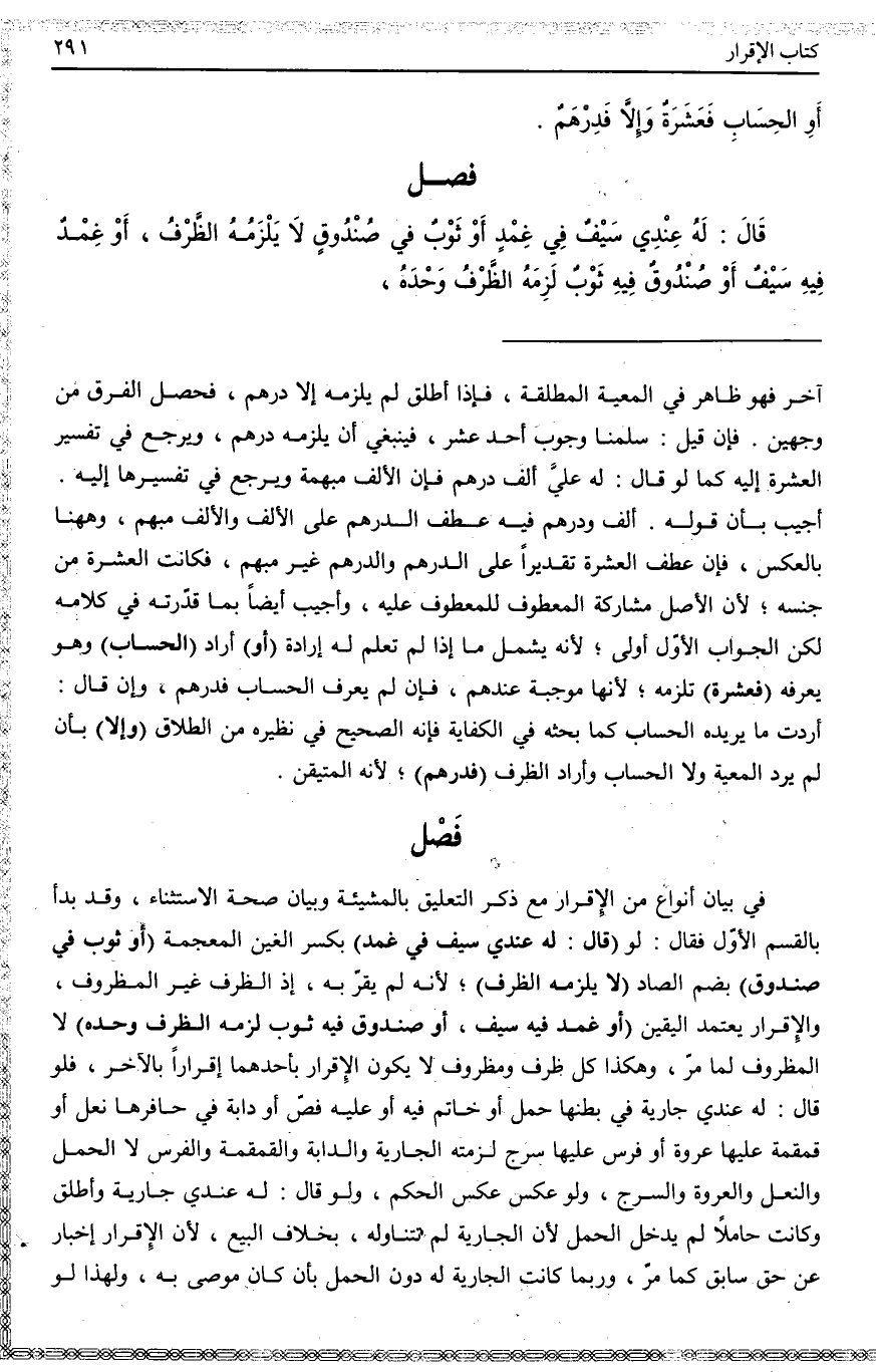 فَصْلٌ فِي بَيَان أَنْوَاعٍ مِنْ الْإِقْرَارِ مَعَ ذِكْرِ التَّعْلِيقِ بِالْمَشِيئَةِ وَبَيَانِ صِحَّةِ الِاسْتِثْنَاءِ، وَقَدْ بَدَأَ بِالْقِسْمِ الْأَوَّلِ فَقَالَ: لَوْ (قَالَ: لَهُ عِنْدِي سَيْفٌ فِي غِمْدٍ) بِكَسْرِ الْغَيْنِ الْمُعْجَمَةِ (أَوْ ثَوْبٌ فِي صُنْدُوقٍ) بِضَمِّ الصَّادِ (لَا يَلْزَمُهُ الظَّرْفُ) ؛ لِأَنَّهُ لَمْ يُقِرَّ بِهِ، إذْ الظَّرْفُ غَيْرُ الْمَظْرُوفِ، وَالْإِقْرَارُ يَعْتَمِدُ الْيَقِينَ (أَوْ غِمْدٌ فِيهِ سَيْفٌ، أَوْ صُنْدُوقٌ فِيهِ ثَوْبٌ لَزِمَهُ الظَّرْفُ وَحْدَهُ) لَا الْمَظْرُوفُ لِمَا مَرَّ، وَهَكَذَا كُلُّ ظَرْفٍ وَمَظْرُوفٍ لَا يَكُونُ الْإِقْرَارُ بِأَحَدِهِمَا إقْرَارًا بِالْآخَرِ، فَلَوْ قَالَ: لَهُ عِنْدِي جَارِيَةٌ فِي بَطْنِهَا حَمْلٌ أَوْ خَاتَمٌ فِيهِ أَوْ عَلَيْهِ فَصٌّ أَوْ دَابَّةٌ فِي حَافِرِهَا نَعْلٌ أَوْ قَمْقَمَةٌ عَلَيْهَا عُرْوَةٌ أَوْ فَرَسٌ عَلَيْهَا سَرْجٌ لَزِمَتْهُ الْجَارِيَةُ وَالدَّابَّةُ وَالْقَمْقَمَةُ وَالْفَرَسُ لَا الْحَمْلُ وَالنَّعْلُ وَالْعُرْوَةُ وَالسَّرْجُ، وَلَوْ عَكَسَ عُكِسَ الْحُكْمُ، وَلَوْ قَالَ: لَهُ عِنْدِي جَارِيَةٌ، وَأَطْلَقَ، وَكَانَتْ حَامِلًا لَمْ يَدْخُلْ الْحَمْلُ؛ لِأَنَّ الْجَارِيَةَ لَمْ تَتَنَاوَلْهُ، بِخِلَافِ الْبَيْعِ؛ لِأَنَّ الْإِقْرَارَ إخْبَارٌ عَنْ حَقٍّ سَابِقٍ كَمَا مَرَّ، وَرُبَّمَا كَانَتْ الْجَارِيَةُ لَهُ دُونَ الْحَمْلِ بِأَنْ كَانَ مُوصًى بِهِ، وَلِهَذَا لَوْ