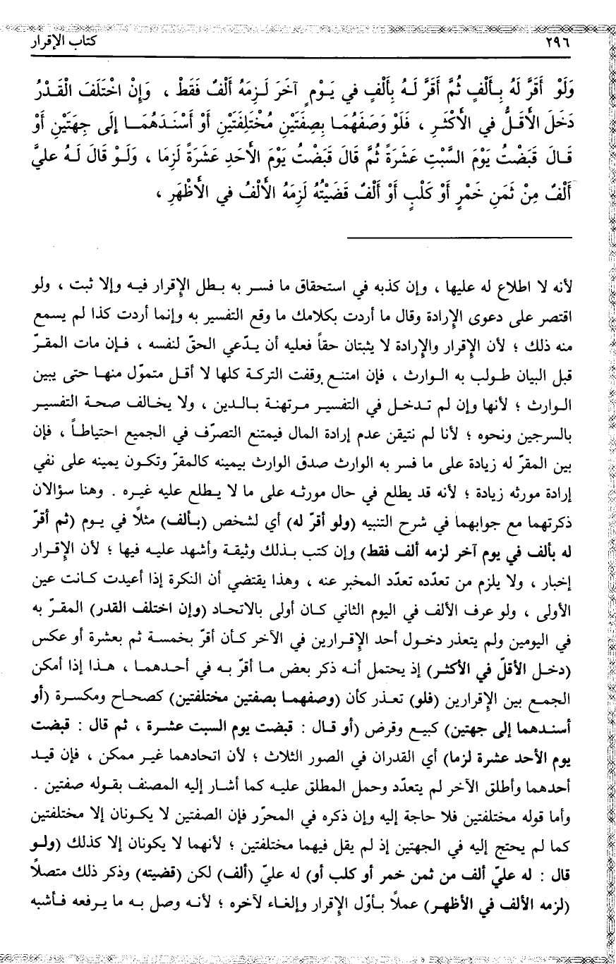 ـــــــــــــــــــــــــــــQلِأَنَّهُ لَا اطِّلَاعَ لَهُ عَلَيْهَا، وَإِنْ كَذَّبَهُ فِي اسْتِحْقَاقِ مَا فَسَّرَ بِهِ بَطَلَ الْإِقْرَارُ فِيهِ وَإِلَّا ثَبَتَ، وَلَوْ اقْتَصَرَ عَلَى دَعْوَى الْإِرَادَةِ وَقَالَ مَا أَرَدْتُ بِكَلَامِك مَا وَقَعَ التَّفْسِيرُ بِهِ وَإِنَّمَا أَرَدْتُ كَذَا لَمْ يُسْمَعْ مِنْهُ ذَلِكَ، لِأَنَّ الْإِقْرَارَ وَالْإِرَادَةَ لَا يَثْبُتَانِ حَقًّا فَعَلَيْهِ أَنْ يَدَّعِيَ الْحَقَّ لِنَفْسِهِ، فَإِنْ مَاتَ الْمُقِرُّ قَبْلَ الْبَيَانِ طُولِبَ بِهِ الْوَارِثُ، فَإِنْ امْتَنَعَ وُقِفَتْ التَّرِكَةُ كُلُّهَا لِأَقَلِّ مُتَمَوِّلٍ مِنْهَا حَتَّى يُبَيِّنَ الْوَارِثُ؛ لِأَنَّهَا، وَإِنْ لَمْ تَدْخُلْ فِي التَّفْسِيرِ مُرْتَهَنَةٌ بِالدَّيْنِ، وَلَا يُخَالِفُ صِحَّةَ التَّفْسِيرِ بِالسِّرْجِينِ وَنَحْوِهِ؛ لِأَنَّا لَمْ نَتَيَقَّنْ عَدَمَ إرَادَةِ الْمَالِ، فَيَمْتَنِعَ التَّصَرُّفُ فِي الْجَمِيعِ احْتِيَاطًا، فَإِنْ بَيَّنَ الْمُقَرُّ لَهُ زِيَادَةً عَلَى مَا فَسَّرَ بِهِ الْوَارِثُ صُدِّقَ الْوَارِثُ بِيَمِينِهِ كَالْمُقِرِّ وَتَكُونُ يَمِينُهُ عَلَى نَفْيِ إرَادَةِ مُوَرِّثِهِ زِيَادَةً؛ لِأَنَّهُ قَدْ يَطَّلِعُ فِي حَالِ مُوَرِّثِهِ عَلَى مَا لَا يَطَّلِعُ عَلَيْهِ غَيْرُهُ. وَهُنَا سُؤَالَانِ ذَكَرَتْهُمَا مَعَ جَوَابِهِمَا فِي شَرْحِ التَّنْبِيهِ.
