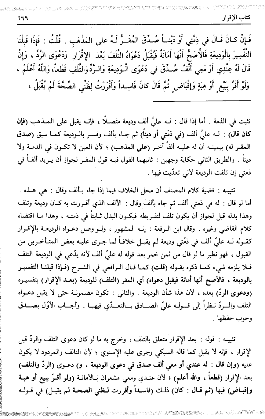 فَإِنْ كَانَ قَالَ فِي ذِمَّتِي أَوْ دَيْنًا صُدِّقَ الْمُقَرُّ لَهُ عَلَى الْمَذْهَبِ قُلْت: فَإِذَا قَبِلْنَا التَّفْسِيرَ الْوَدِيعَةِ فَالْأَصَحُّ أَنَّهَا أَمَانَةٌ فَيُقْبَلُ دَعْوَاهُ التَّلَفَ بَعْدَ الْإِقْرَارِ وَدَعْوَى الرَّدِّ،، وَإِنْ قَالَ لَهُ عِنْدِي أَوْ مَعِي أَلْفٌ صُدِّقَ فِي دَعْوَى الْوَدِيعَةِ وَالرَّدِّ وَالتَّلَفِ قَطْعًا، وَاَللَّهُ أَعْلَمُ.