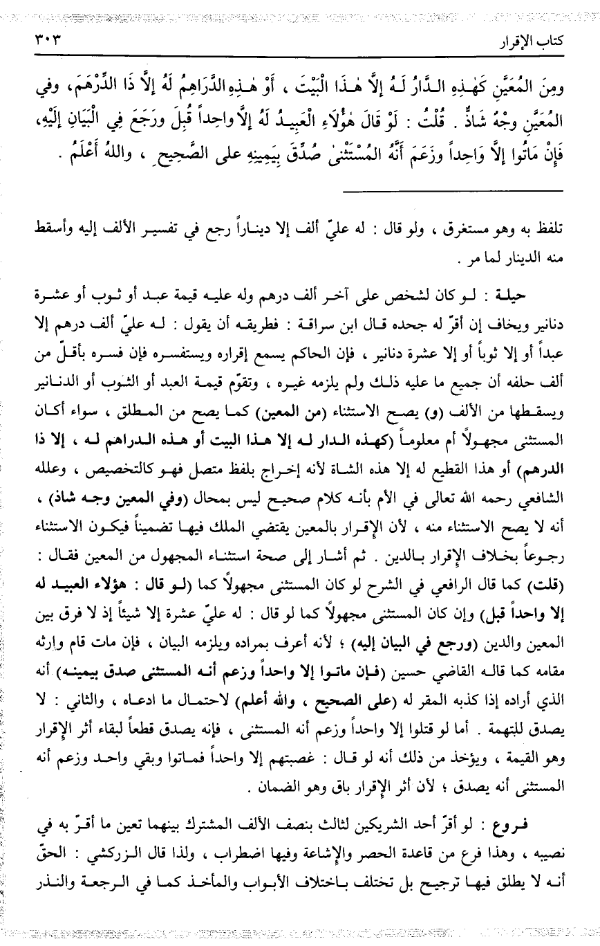 فُرُوعٌ لَوْ أَقَرَّ أَحَدُ الشَّرِيكَيْنِ لِثَالِثٍ بِنِصْفِ الْأَلْفِ الْمُشْتَرَكِ بَيْنَهُمَا تَعَيَّنَ مَا أَقَرَّ بِهِ فِي نَصِيبِهِ، وَهَذَا فَرْعٌ مِنْ قَاعِدَةِ الْحَصْرِ وَالْإِشَاعَةِ وَفِيهَا اضْطِرَابٌ، وَلِذَا قَالَ الزَّرْكَشِيُّ: الْحَقُّ أَنَّهُ لَا يُطْلَقُ فِيهَا تَرْجِيحٌ بَلْ تَخْتَلِفُ بِاخْتِلَافِ الْأَبْوَابِ وَالْمَأْخَذِ كَمَا فِي الرَّجْعَةِ وَالنَّذْرِ