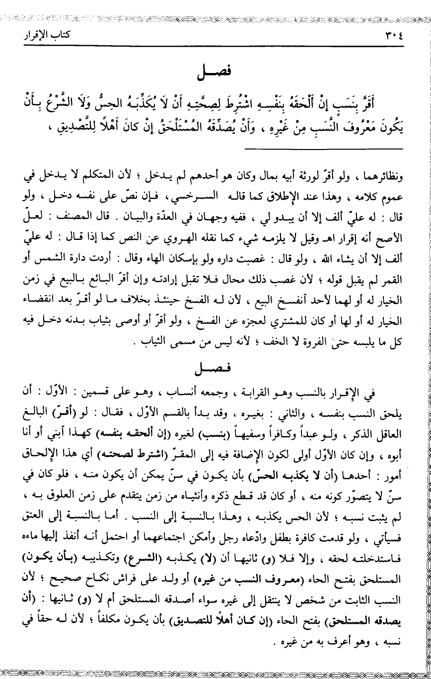 فَصْلٌ أَقَرَّ بِنَسَبٍ إنْ أَلْحَقَهُ بِنَفْسِهِ اُشْتُرِطَ لِصِحَّتِهِ أَنْ لَا يُكَذِّبَهُ الْحِسُّ وَلَا الشَّرْعُ بِأَنْ يَكُونَ مَعْرُوفَ النَّسَبِ مِنْ غَيْرِهِ، وَأَنْ يُصَدِّقَهُ الْمُسْتَلْحَقُ إنْ كَانَ أَهْلًا لِلتَّصْدِيقِ.