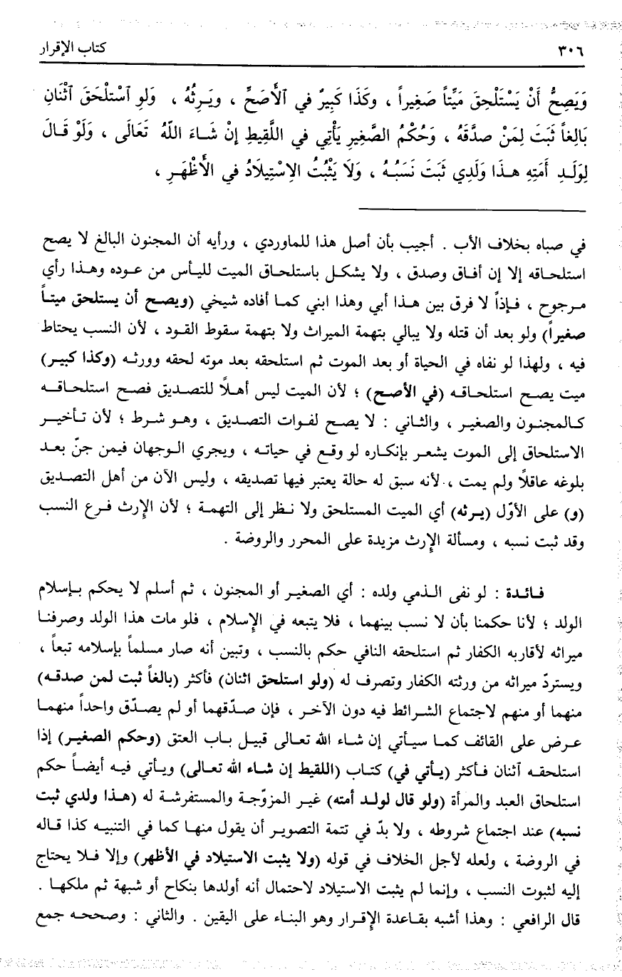 فَائِدَةٌ لَوْ نَفَى الذِّمِّيُّ وَلَدَهُ: أَيْ: الصَّغِيرَ أَوْ الْمَجْنُونَ، ثُمَّ أَسْلَمَ لَا يُحْكَمُ بِإِسْلَامِ الْوَلَدِ؛ لِأَنَّا حَكَمْنَا بِأَنْ لَا نَسَبَ بَيْنَهُمَا، فَلَا يَتْبَعُهُ فِي الْإِسْلَامِ، فَلَوْ مَاتَ هَذَا الْوَلَدُ، وَصَرَفْنَا مِيرَاثَهُ لِأَقَارِبِهِ الْكُفَّارِ ثُمَّ اسْتَلْحَقَهُ النَّافِي حُكِمَ بِالنَّسَبِ، وَتَبَيَّنَ أَنَّهُ صَارَ مُسْلِمًا بِإِسْلَامِهِ تَبَعًا، وَيَسْتَرِدُّ مِيرَاثَهُ مِنْ وَرَثَتِهِ الْكُفَّارِ وَتُصْرَفُ لَهُ.