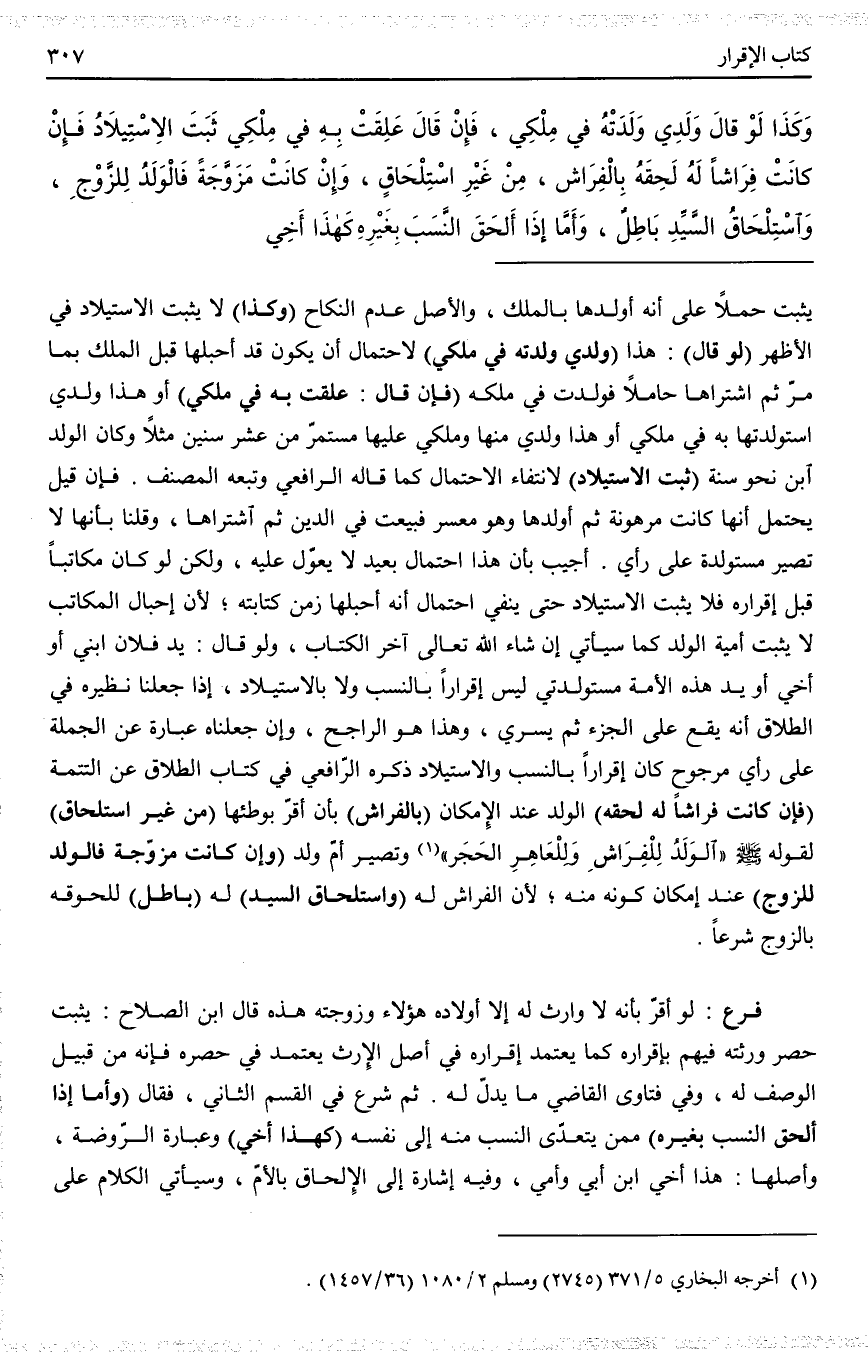 أُجِيبَ بِأَنَّ هَذَا احْتِمَالٌ بَعِيدٌ لَا يُعَوَّلُ عَلَيْهِ، وَلَكِنْ لَوْ كَانَ مُكَاتَبًا قَبْلَ إقْرَارِهِ فَلَا يَثْبُتُ الِاسْتِيلَادُ حَتَّى يَنْفِيَ احْتِمَالُ أَنَّهُ أَحْبَلَهَا زَمَنَ كِتَابَتِهِ؛ لِأَنَّ إحْبَالَ الْمُكَاتَبِ لَا يُثْبِتُ أُمِّيَّةَ الْوَلَدِ كَمَا سَيَأْتِي إنْ شَاءَ اللَّهُ تَعَالَى آخِرَ الْكِتَابِ، وَلَوْ قَالَ: يَدُ فُلَانٍ ابْنِي أَوْ أَخِي أَوْ يَدُ هَذِهِ الْأَمَةِ مُسْتَوْلَدَتِي لَيْسَ إقْرَارًا بِالنَّسَبِ وَلَا بِالِاسْتِيلَادِ، إذَا جَعَلْنَا نَظِيرَهُ فِي الطَّلَاقِ أَنَّهُ يَقَعُ عَلَى الْجُزْءِ ثُمَّ يَسْرِي، وَهَذَا هُوَ الرَّاجِحُ، وَإِنْ جَعَلْنَاهُ عِبَارَةً عَنْ الْجُمْلَةِ عَلَى رَأْيٍ مَرْجُوحٍ كَانَ إقْرَارًا بِالنَّسَبِ وَالِاسْتِيلَادِ ذَكَرَهُ الرَّافِعِيُّ فِي كِتَابِ الطَّلَاقِ عَنْ التَّتِمَّةِ (فَإِنْ كَانَتْ فِرَاشًا لَهُ لَحِقَهُ) الْوَلَدُ عِنْدَ الْإِمْكَانِ (بِالْفِرَاشِ) بِأَنْ أَقَرَّ بِوَطْئِهَا (مِنْ غَيْرِ اسْتِلْحَاقٍ) لِقَوْلِهِ - صَلَّى اللَّهُ عَلَيْهِ وَسَلَّمَ - «الْوَلَدُ لِلْفِرَاشِ وَلِلْعَاهِرِ الْحَجَرُ» وَتَصِيرُ أُمَّ وَلَدٍ (وَإِنْ كَانَتْ مُزَوَّجَةً فَالْوَلَدُ لِلزَّوْجِ) عِنْدَ إمْكَانِ كَوْنِهِ مِنْهُ؛ لِأَنَّ الْفِرَاشَ لَهُ (وَاسْتِلْحَاقُ السَّيِّدِ) لَهُ (بَاطِلٌ) لِلُحُوقِهِ بِالزَّوْجِ شَرْعًا.