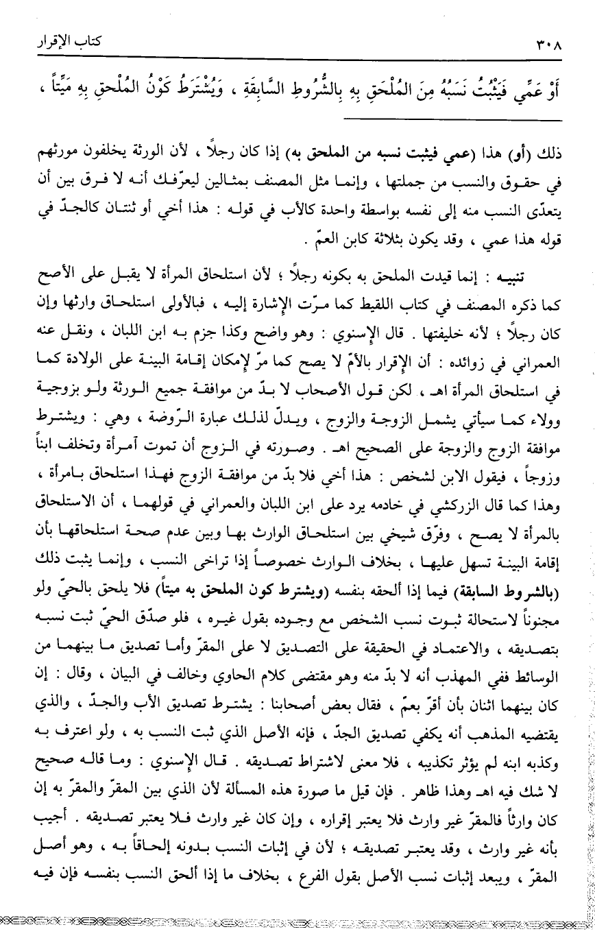 ـــــــــــــــــــــــــــــQذَلِكَ (أَوْ) هَذَا (عَمِّي، فَيَثْبُتُ نَسَبُهُ مِنْ الْمُلْحَقِ بِهِ) إذَا كَانَ رَجُلًا؛ لِأَنَّ الْوَرَثَةَ يَخْلُفُونَ مُوَرِّثَهُمْ فِي حُقُوقٍ وَالنَّسَبُ مِنْ جُمْلَتِهَا، وَإِنَّمَا مَثَّلَ الْمُصَنِّفُ بِمِثَالَيْنِ لِيُعَرِّفكِ أَنَّهُ لَا فَرْقَ بَيْنَ أَنْ يَتَعَدَّى النَّسَبُ مِنْهُ إلَى نَفْسِهِ بِوَاسِطَةٍ وَاحِدَةٍ كَالْأَبِ فِي قَوْلِهِ: هَذَا أَخِي أَوْ ثِنْتَانِ كَالْجَدِّ فِي قَوْلِهِ هَذَا عَمِّي، وَقَدْ يَكُونُ بِثَلَاثَةٍ كَابْنِ الْعَمِّ.