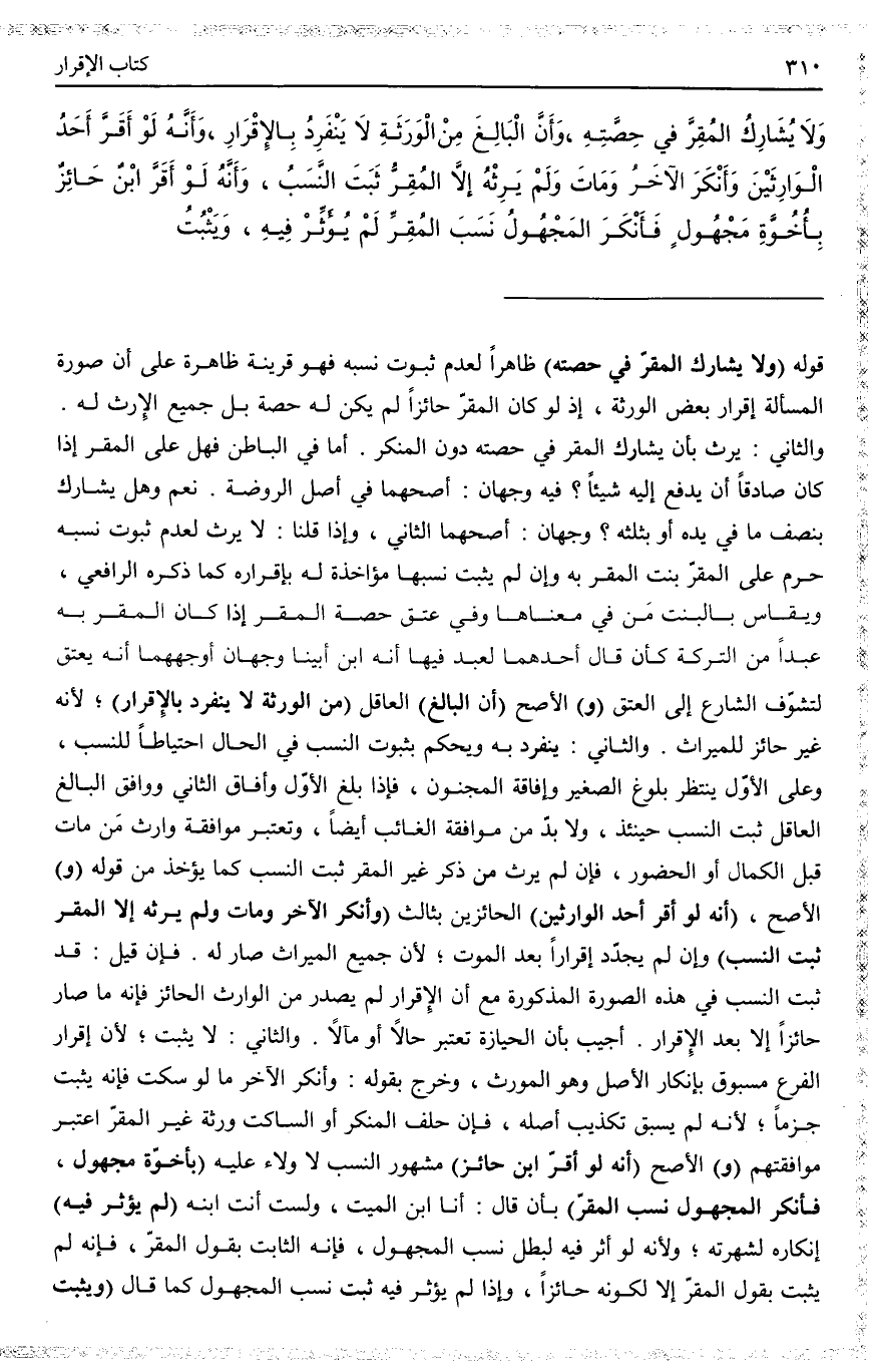 وَلَا يُشَارِكُ الْمُقِرَّ فِي حِصَّتِهِ، وَأَنَّ الْبَالِغَ مِنْ الْوَرَثَةِ لَا يَنْفَرِدُ بِالْإِقْرَارِ.