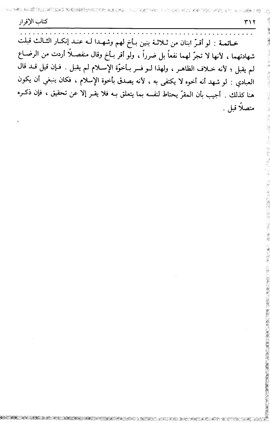 ـــــــــــــــــــــــــــــQخَاتِمَةٌ: لَوْ أَقَرَّ ابْنَانِ مِنْ ثَلَاثَةٍ بَنِينَ بِأَخٍ لَهُمْ وَشَهِدَا لَهُ عِنْدَ إنْكَارِ الثَّالِثِ قُبِلَتْ شَهَادَتُهُمَا؛ لِأَنَّهَا لَا تَجُرُّ لَهُمَا نَفْعًا بَلْ ضَرَرًا، وَلَوْ أَقَرَّ بِأَخٍ وَقَالَ مُنْفَصِلًا أَرَدْتُ مِنْ الرَّضَاعِ لَمْ يُقْبَلْ؛ لِأَنَّهُ خِلَافُ الظَّاهِرِ، وَلِهَذَا لَوْ فُسِّرَ بِأُخُوَّةِ الْإِسْلَامِ لَمْ يُقْبَلْ. فَإِنْ قِيلَ قَدْ قَالَ الْعَبَّادِيُّ: لَوْ شَهِدَ أَنَّهُ أَخُوهُ لَا يُكْتَفَى بِهِ؛ لِأَنَّهُ يَصْدُقُ بِأُخُوَّةِ الْإِسْلَامِ، فَكَانَ يَنْبَغِي أَنْ يَكُونَ هُنَا كَذَلِكَ.