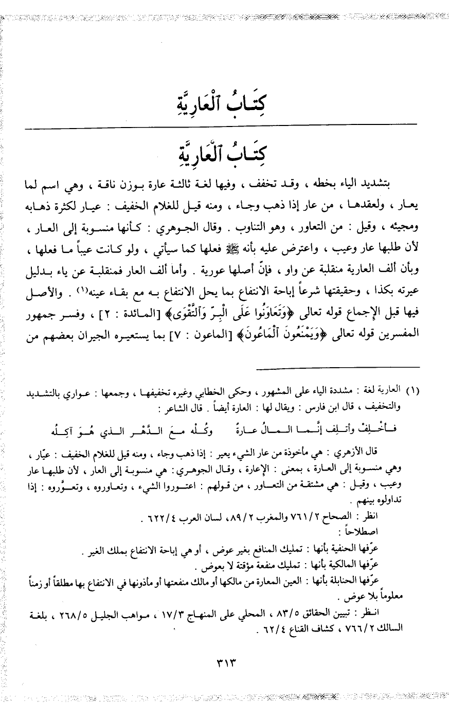 ـــــــــــــــــــــــــــــQكِتَابُ الْعَارِيَّةِ بِتَشْدِيدِ الْيَاءِ بِخَطِّهِ، وَقَدْ تُخَفَّفُ، وَفِيهَا لُغَةٌ ثَالِثَةٌ عَارَةٌ بِوَزْنِ نَاقَةٍ، وَهِيَ اسْمٌ لِمَا يُعَارُ، وَلِعَقْدِهَا، مِنْ عَارَ إذَا ذَهَبَ وَجَاءَ، وَمِنْهُ قِيلَ لِلْغُلَامِ الْخَفِيفِ: عَيَّارٌ لِكَثْرَةِ ذَهَابِهِ وَمَجِيئِهِ، وَقِيلَ: مِنْ التَّعَاوُرِ، وَهُوَ التَّنَاوُبُ. وَقَالَ الْجَوْهَرِيُّ: كَأَنَّهَا مَنْسُوبَةٌ إلَى الْعَارِ؛ لِأَنَّ طَلَبَهَا عَارٌ وَعَيْبٌ، وَاعْتُرِضَ عَلَيْهِ بِأَنَّهُ - صَلَّى اللَّهُ عَلَيْهِ وَسَلَّمَ - فَعَلَهَا كَمَا سَيَأْتِي، وَلَوْ كَانَتْ عَيْبًا مَا فَعَلَهَا، وَبِأَنَّ أَلِفَ الْعَارِيَّةِ مُنْقَلِبَةٌ عَنْ وَاوٍ، فَإِنَّ أَصْلَهَا عَوَرِيَّةٌ. وَأَمَّا أَلِفُ الْعَارِ فَمُنْقَلِبَةٌ عَنْ يَاءٍ بِدَلِيلِ عَيَّرْته بِكَذَا، وَحَقِيقَتُهَا شَرْعًا إبَاحَةُ الِانْتِفَاعِ بِمَا يَحِلُّ الِانْتِفَاعُ بِهِ مَعَ بَقَاءِ عَيْنِهِ وَالْأَصْلُ فِيهَا قَبْلَ الْإِجْمَاعِ قَوْله تَعَالَى {وَتَعَاوَنُوا عَلَى الْبِرِّ وَالتَّقْوَى} [المائدة: 2] ، وَفَسَّرَ جُمْهُورُ الْمُفَسِّرِينَ قَوْله تَعَالَى {وَيَمْنَعُونَ الْمَاعُونَ} [الماعون: 7] بِمَا يَسْتَعِيرُهُ الْجِيرَانُ بَعْضُهُمْ مِنْ
