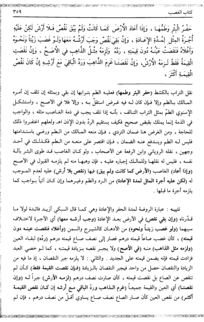 وَلَعَلَّهُمْ اغْتَفَرُوا ذَلِكَ لِلْحَاجَةِ، وَمِنْ الْغَرَضِ هُنَا ضَمَانُ التَّرَدِّي، فَإِنْ مَنَعَهُ الْمَالِكُ مِنْ الطَّمِّ وَرَضِيَ بِاسْتِدَامَتِهَا فَلَيْسَ لَهُ الطَّمُّ وَيَنْدَفِعُ عَنْهُ الضَّمَانُ، فَإِنْ اقْتَصَرَ عَلَى مَنْعِهِ مِنْ الطَّمِّ فَكَذَلِكَ فِي أَحَدِ وَجْهَيْنِ، نَقَلَهُ الرُّويَانِيُّ وَابْنُ الرِّفْعَةِ عَنْ الْأَصْحَابِ، وَلَوْ كَانَ الْغَاصِبُ قَدْ طَوَى الْبِئْرَ بِآلَةِ نَفْسِهِ، فَلَيْسَ لَهُ نَقْلُهَا وَلِلْمَالِكِ إجْبَارُهُ عَلَيْهِ، فَإِنْ وَهَبَهَا مِنْهُ لَمْ يَلْزَمْهُ الْقَبُولُ فِي الْأَصَحِّ (وَإِذَا أَعَادَ) الْغَاصِبُ (الْأَرْضَ كَمَا كَانَتْ وَلَمْ يَبْقَ) فِيهَا (نَقْصٌ فَلَا أَرْشَ) عَلَيْهِ لِعَدَمِ الْمُوجِبِ لَهُ (لَكِنْ عَلَيْهِ أُجْرَةُ الْمِثْلِ لِمُدَّةِ الْإِعَادَةِ) مِنْ الرَّدِّ وَالطَّمِّ وَغَيْرِهِمَا وَإِنْ كَانَ آتِيًا بِوَاجِبٍ كَمَا يَلْزَمُهُ أُجْرَةُ مَا قَبْلَهَا.