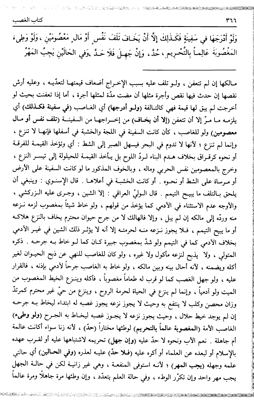 ـــــــــــــــــــــــــــــQمَالِكِهَا إنْ لَمْ تَتَعَفَّنْ، وَلَوْ تَلِفَ عَلَيْهِ بِسَبَبِ الْإِخْرَاجِ أَضْعَافُ قِيمَتِهَا لِتَعَدِّيهِ، وَعَلَيْهِ أَرْشُ نَقْصِهَا إنْ حَدَثَ فِيهَا نَقْصٌ وَأُجْرَةُ مِثْلِهَا إنْ مَضَتْ مُدَّةٌ لِمِثْلِهَا أُجْرَةٌ، أَمَّا إذَا تَعَفَّنَتْ بِحَيْثُ لَوْ أُخْرِجَتْ لَمْ يَبْقَ لَهَا قِيمَةٌ فَهِيَ كَالتَّالِفَةِ (وَلَوْ أَدْرَجَهَا) أَيْ الْغَاصِبُ (فِي سَفِينَةٍ فَكَذَلِكَ) أَيْ يَلْزَمُهُ مَا مَرَّ إلَّا أَنْ تَتَعَفَّنَ (إلَّا أَنْ يَخَافَ) مِنْ إخْرَاجِهَا مِنْ السَّفِينَةِ (تَلَفَ نَفْسٍ أَوْ مَالٍ مَعْصُومَيْنِ) وَلَوْ لِلْغَاصِبِ، كَأَنْ كَانَتْ السَّفِينَةُ فِي اللُّجَّةِ وَالْخَشَبَةِ فِي أَسْفَلِهَا فَإِنَّهَا لَا تُنْزَعُ، وَإِنَّمَا لَمْ تُنْزَعُ؛ لِأَنَّهَا لَا تَدُومُ فِي الْبَحْرِ فَيَسْهُلُ الصَّبْرُ إلَى الشَّطِّ: أَيْ وَتُؤْخَذُ الْقِيمَةُ لِلْفُرْقَةِ أَوْ نَحْوِهِ كَرَقْرَاقٍ بِخِلَافِ هَدْمِ الْبِنَاءِ لِرَدِّ اللَّوْحِ بَلْ يَأْخُذُ الْقِيمَةَ لِلْحَيْلُولَةِ إلَى تَيَسُّرِ النَّزْعِ، وَخَرَجَ بِالْمَعْصُومَيْنِ نَفْسُ الْحَرْبِيِّ وَمَالُهُ، وَبِالْخَوْفِ الْمَذْكُورِ مَا لَوْ كَانَتْ السَّفِينَةُ عَلَى الْأَرْضِ أَوْ مُرْسَاةً عَلَى الشَّطِّ أَوْ نَحْوِهِ. أَوْ كَانَتْ الْخَشَبَةُ فِي أَعْلَاهَا. قَالَ الْإِسْنَوِيُّ: وَيَنْبَغِي أَنْ يُلْحَقَ بِالتَّلَفِ مَا يُبِيحُ التَّيَمُّمَ. قَالَ الْوَلِيُّ الْعِرَاقِيُّ: إلَّا الشَّيْنَ، وَجَرَى عَلَيْهِ الزَّرْكَشِيُّ، وَالْأَوْجَهُ عَدَمُ الِاسْتِثْنَاء فِي الْآدَمِيِّ كَمَا يُؤْخَذُ مِنْ قَوْلِهِمْ.