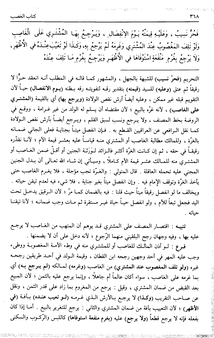 ـــــــــــــــــــــــــــــQالتَّحْرِيمِ (فَحُرٌّ نَسِيبٌ) لِلشُّبْهَةِ بِالْجَهْلِ، وَالْمَشْهُورُ كَمَا قَالَهُ فِي الْمَطْلَبِ أَنَّهُ انْعَقَدَ حُرًّا لَا رَقِيقًا ثُمَّ عَتَقَ (وَعَلَيْهِ) لِلسَّيِّدِ (قِيمَتُهُ) بِتَقْدِيرِ رِقِّهِ لِتَفْوِيتِهِ رِقَّهُ بِظَنِّهِ (يَوْمَ الِانْفِصَالِ) حَيًّا؛ لِأَنَّ التَّقْوِيمَ قَبْلَهُ غَيْرُ مُمْكِنٍ، وَعَلَيْهِ أَيْضًا أَرْشُ نَقْصِ الْوِلَادَةِ (وَيَرْجِعُ بِهَا) أَيْ بِالْقِيمَةِ (الْمُشْتَرِي عَلَى الْغَاصِبِ) ؛ لِأَنَّهُ غَرَّهُ بِالْبَيْعِ؛ لِأَنَّ مُقْتَضَاهُ أَنْ يُسَلِّمَ لَهُ الْوَلَدَ مِنْ غَيْرِ غَرَامَةٍ، وَوَقَعَ فِي الرَّوْضَةِ بِخَطِّ الْمُصَنِّفِ، وَلَا يَرْجِعُ وَنُسِبَ لِسَبْقِ الْقَلَمِ، وَيَرْجِعُ أَيْضًا بِأَرْشِ نَقْصِ الْوِلَادَةِ كَمَا نَقَلَ الرَّافِعِيُّ عَنْ الْعِرَاقِيِّينَ الْقَطْعَ بِهِ.