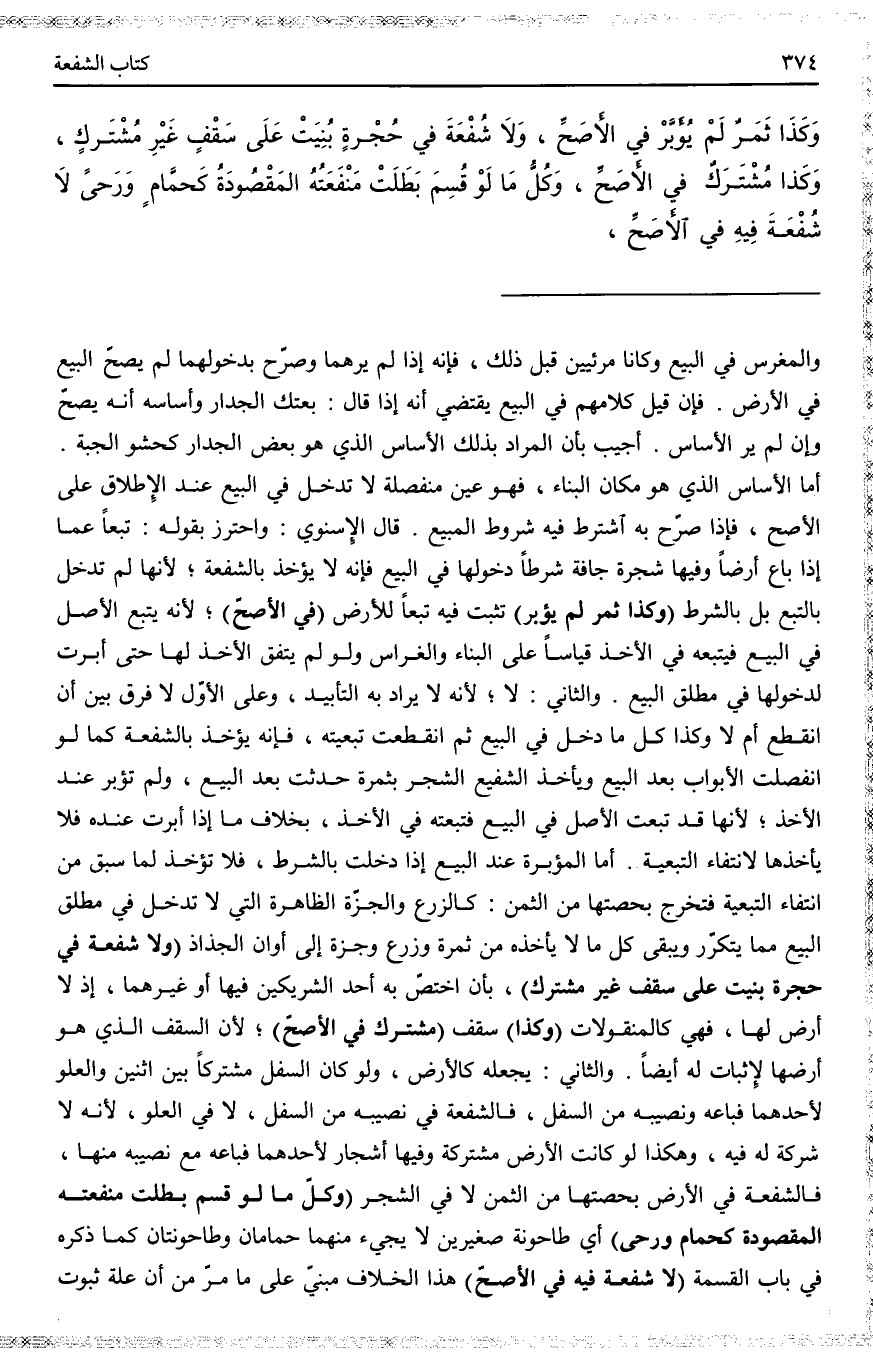 وَلَا شُفْعَةَ فِي حُجْرَةٍ بُنِيَتْ عَلَى سَقْفٍ غَيْرِ مُشْتَرَكٍ) ، بِأَنْ اخْتَصَّ بِهِ أَحَدُ الشَّرِيكَيْنِ فِيهَا أَوْ غَيْرُهُمَا، إذْ لَا أَرْضَ لَهَا، فَهِيَ كَالْمَنْقُولَاتِ (وَكَذَا) سَقْفٌ (مُشْتَرَكٌ فِي الْأَصَحِّ) ؛ لِأَنَّ السَّقْفَ الَّذِي هُوَ أَرْضُهَا لَا ثَبَاتَ لَهُ أَيْضًا. وَالثَّانِي: يَجْعَلُهُ كَالْأَرْضِ، وَلَوْ كَانَ السُّفْلُ مُشْتَرَكًا بَيْنَ اثْنَيْنِ وَالْعُلْوُ لِأَحَدِهِمَا فَبَاعَهُ وَنَصِيبَهُ مِنْ السُّفْلِ، فَالشُّفْعَةُ فِي نَصِيبِهِ مِنْ السُّفْلِ، لَا فِي الْعُلْوِ؛ لِأَنَّهُ لَا شَرِكَةَ لَهُ فِيهِ، وَهَكَذَا لَوْ كَانَتْ الْأَرْضُ مُشْتَرَكَةً وَفِيهَا أَشْجَارٌ لِأَحَدِهِمَا فَبَاعَهُ مَعَ نَصِيبِهِ مِنْهَا، فَالشُّفْعَةُ فِي الْأَرْضِ بِحِصَّتِهَا مِنْ الثَّمَنِ لَا فِي الشَّجَرِ (وَكُلُّ مَا لَوْ قُسِمَ بَطَلَتْ مَنْفَعَتُهُ الْمَقْصُودَةُ كَحَمَّامٍ وَرَحًى) أَيْ طَاحُونَةٍ، صَغِيرَيْنِ لَا يَجِيءُ مِنْهُمَا حَمَّامَانِ وَطَاحُونَتَانِ كَمَا ذَكَرَهُ فِي بَابِ الْقِسْمَةِ (لَا شُفْعَةَ فِيهِ فِي الْأَصَحِّ) هَذَا الْخِلَافُ مَبْنِيٌّ عَلَى مَا مَرَّ مِنْ أَنَّ عِلَّةَ ثُبُوتِ