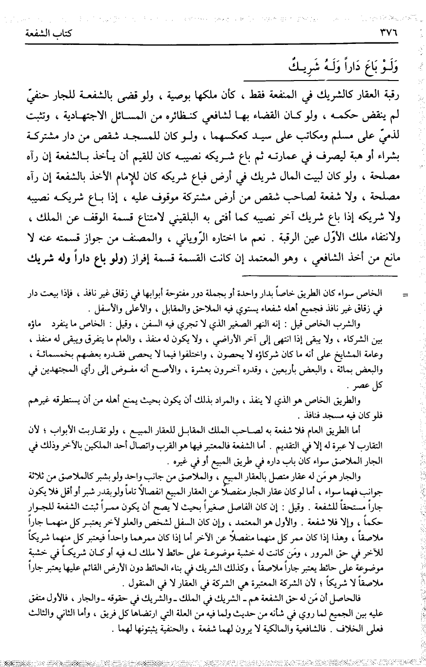 ـــــــــــــــــــــــــــــQرَقَبَةِ الْعَقَارِ كَالشَّرِيكِ فِي الْمَنْفَعَةِ فَقَطْ، كَأَنْ مَلَكَهَا بِوَصِيَّةٍ، وَلَوْ قَضَى بِالشُّفْعَةِ لِلْجَارِ حَنَفِيٌّ لَمْ يَنْقَضِ حُكْمُهُ، وَلَوْ كَانَ الْقَضَاءُ بِهَا لِشَافِعِيٍّ كَنَظَائِرِهِ مِنْ الْمَسَائِلِ الِاجْتِهَادِيَّةِ، وَتَثْبُتُ لِذِمِّيٍّ عَلَى مُسْلِمٍ وَمُكَاتَبٍ عَلَى سَيِّدٍ كَعَكْسِهِمَا، وَلَوْ كَانَ لِلْمَسْجِدِ شِقْصٌ مِنْ دَارٍ مُشْتَرَكَةٍ بِشِرَاءٍ أَوْ هِبَةٍ لِيُصْرَفَ فِي عِمَارَتِهِ ثُمَّ بَاعَ شَرِيكُهُ نَصِيبَهُ كَانَ لِلْقَيِّمِ أَنْ يَأْخُذَ بِالشُّفْعَةِ إنْ رَآهُ مَصْلَحَةً، وَلَوْ كَانَ لِبَيْتِ الْمَالِ شَرِيكٌ فِي أَرْضٍ فَبَاعَ شَرِيكُهُ كَانَ لِلْإِمَامِ الْأَخْذُ بِالشُّفْعَةِ إنْ رَآهُ مَصْلَحَةً، وَلَا شُفْعَةَ لِصَاحِبِ شِقْصٍ مِنْ أَرْضٍ مُشْتَرَكَةٍ مَوْقُوفٍ عَلَيْهِ، إذَا بَاعَ شَرِيكُهُ نَصِيبَهُ وَلَا شَرِيكُهُ إذَا بَاعَ شَرِيكٌ آخَرُ نَصِيبَهُ كَمَا أَفْتَى بِهِ الْبُلْقِينِيُّ لِامْتِنَاعِ قِسْمَةِ الْوَقْفِ عَنْ الْمِلْكِ، وَلِانْتِفَاءِ مِلْكِ الْأَوَّلِ عَيْنَ الرَّقَبَةِ. نَعَمْ مَا اخْتَارَهُ الرُّويَانِيُّ، وَالْمُصَنِّفُ مِنْ جَوَازِ قِسْمَتِهِ عَنْهُ لَا مَانِعَ مِنْ أَخْذِ الشَّافِعِيِّ، وَهُوَ الْمُعْتَمَدُ إنْ كَانَتْ الْقِسْمَةُ قِسْمَةَ إفْرَازٍ.