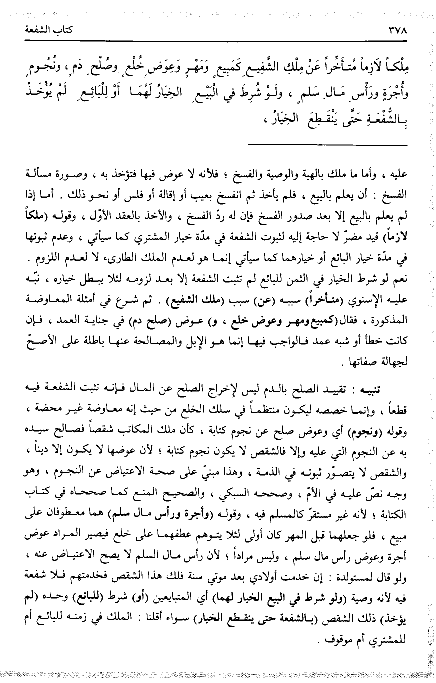 ـــــــــــــــــــــــــــــQعَلَيْهِ، وَأَمَّا مَا مُلِكَ بِالْهِبَةِ وَالْوَصِيَّةِ وَالْفَسْخِ؛ فَلِأَنَّهُ لَا عِوَضَ فِيهَا فَتُؤْخَذُ بِهِ، وَصُورَةُ مَسْأَلَةِ الْفَسْخِ: أَنْ يَعْلَمَ بِالْبَيْعِ، فَلَمْ يَأْخُذْ ثُمَّ انْفَسَخَ بِعَيْبٍ أَوْ إقَالَةٍ أَوْ فَلَسٍ أَوْ نَحْوِ ذَلِكَ. أَمَّا إذَا لَمْ يَعْلَمْ بِالْبَيْعِ إلَّا بَعْدَ صُدُورِ الْفَسْخِ فَإِنَّ لَهُ رَدَّ الْفَسْخِ، وَالْأَخْذَ بِالْعَقْدِ الْأَوَّلِ، وَقَوْلُهُ (مِلْكًا لَازِمًا) قَيْدٌ مُضِرٌّ لَا حَاجَةَ إلَيْهِ لِثُبُوتِ الشُّفْعَةِ فِي مُدَّةِ خِيَارِ الْمُشْتَرِي كَمَا سَيَأْتِي، وَعَدَمُ ثُبُوتِهَا فِي مُدَّةِ خِيَارِ الْبَائِعِ أَوْ خِيَارِهِمَا كَمَا سَيَأْتِي إنَّمَا هُوَ لِعَدَمِ الْمِلْكِ الطَّارِئِ لَا لِعَدَمِ اللُّزُومِ. نَعَمْ لَوْ شُرِطَ الْخِيَارُ فِي الثَّمَنِ لِلْبَائِعِ لَمْ تَثْبُتْ الشُّفْعَةُ إلَّا بَعْدَ لُزُومِهِ لِئَلَّا يَبْطُلَ خِيَارُهُ، نَبَّهَ عَلَيْهِ الْإِسْنَوِيُّ (مُتَأَخِّرًا) سَبَبُهُ (عَنْ) سَبَبِ (مِلْكِ الشَّفِيعِ) . ثُمَّ شَرَعَ فِي أَمْثِلَةِ الْمُعَاوَضَةِ الْمَذْكُورَةِ، فَقَالَ (كَمَبِيعٍ وَمَهْرٍ وَعِوَضِ خُلْعٍ، وَ) عِوَضِ (صُلْحِ دَمٍ) فِي جِنَايَةِ الْعَمْدِ، فَإِنْ كَانَتْ خَطَأً أَوْ شِبْهَ عَمْدٍ فَالْوَاجِبُ فِيهَا إنَّمَا هُوَ الْإِبِلُ وَالْمُصَالَحَةُ عَنْهَا بَاطِلَةٌ عَلَى الْأَصَحِّ لِجَهَالَةِ صِفَاتِهَا.