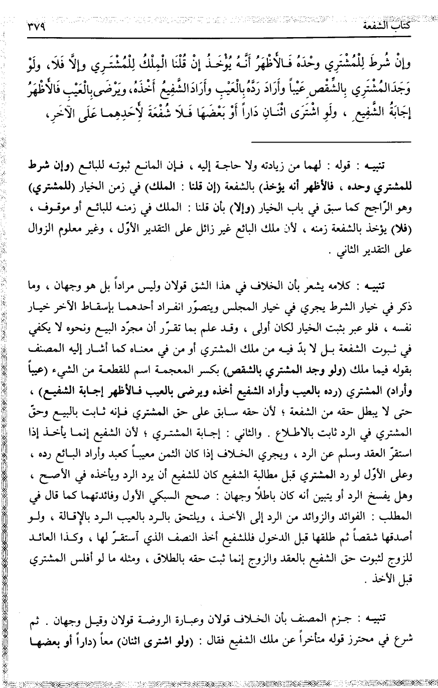 ـــــــــــــــــــــــــــــQتَنْبِيهٌ قَوْلُهُ: لَهُمَا مِنْ زِيَادَتِهِ وَلَا حَاجَةَ إلَيْهِ، فَإِنَّ الْمَانِعَ ثُبُوتُهُ لِلْبَائِعِ (وَإِنْ شُرِطَ لِلْمُشْتَرِي وَحْدَهُ، فَالْأَظْهَرُ أَنَّهُ يُؤْخَذُ) بِالشُّفْعَةِ (إنْ قُلْنَا: الْمِلْكُ) فِي زَمَنِ الْخِيَارِ (لِلْمُشْتَرِي) وَهُوَ الرَّاجِحُ كَمَا سَبَقَ فِي بَابِ الْخِيَارِ (وَإِلَّا) بِأَنْ قُلْنَا: الْمِلْكُ فِي زَمَنِهِ لِلْبَائِعِ أَوْ مَوْقُوفٌ (فَلَا) يُؤْخَذُ بِالشُّفْعَةِ زَمَنَهُ؛ لِأَنَّ مِلْكَ الْبَائِعِ غَيْرُ زَائِلٍ عَلَى التَّقْدِيرِ الْأَوَّلِ، وَغَيْرُ مَعْلُومِ الزَّوَالِ عَلَى التَّقْدِيرِ الثَّانِي.