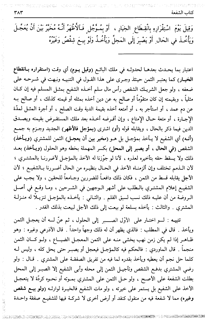 وَقِيلَ يَوْمَ اسْتِقْرَارِهِ بِانْقِطَاعِ الْخِيَارِ، أَوْ بِمُؤَجَّلٍ فَالْأَظْهَرُ أَنَّهُ مُخَيَّرٌ بَيْنَ أَنْ يُعَجِّلَ وَيَأْخُذَ فِي الْحَالِ أَوْ يَصْبِرَ إلَى الْمَحَلِّ يَأْخُذُ وَلَوْ بِيعَ شِقْصٌ وَغَيْرُهُ